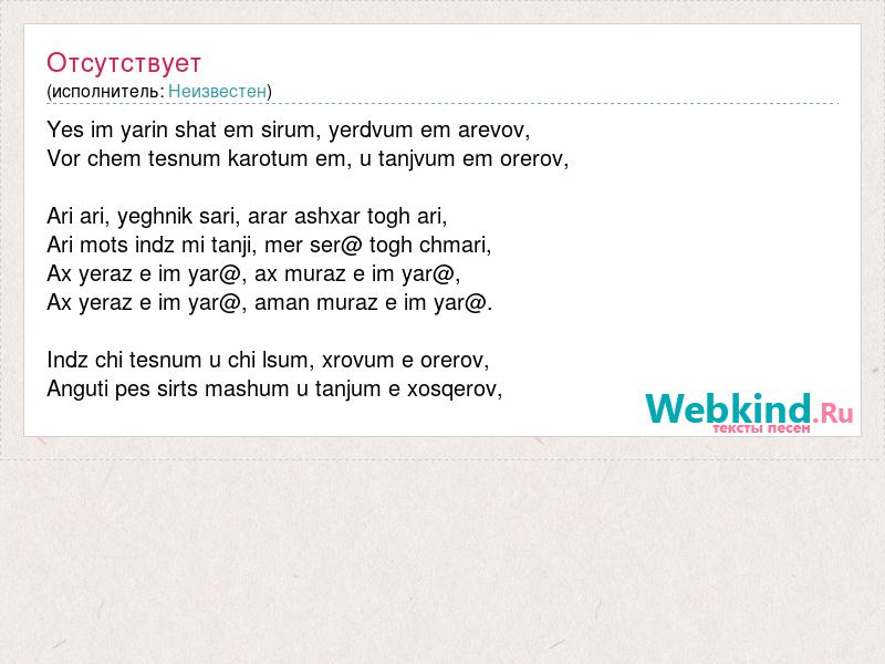 Yes im yarin shat em sirum, yerdvum em arevov, Vor chem tesnum karotum em, u tanjvum em orerov, Ari ari, yeghnik sari, arar ashxar togh ari, Ari mots indz mi tanji, mer ser@ togh chmari, Ax yeraz e im yar@, ax muraz e im yar@, Ax yeraz e im yar@, aman muraz e im yar@. Indz chi tesnum u chi lsum, xrovum e orerov, Anguti pes sirts mashum u tanjum e xosqerov,