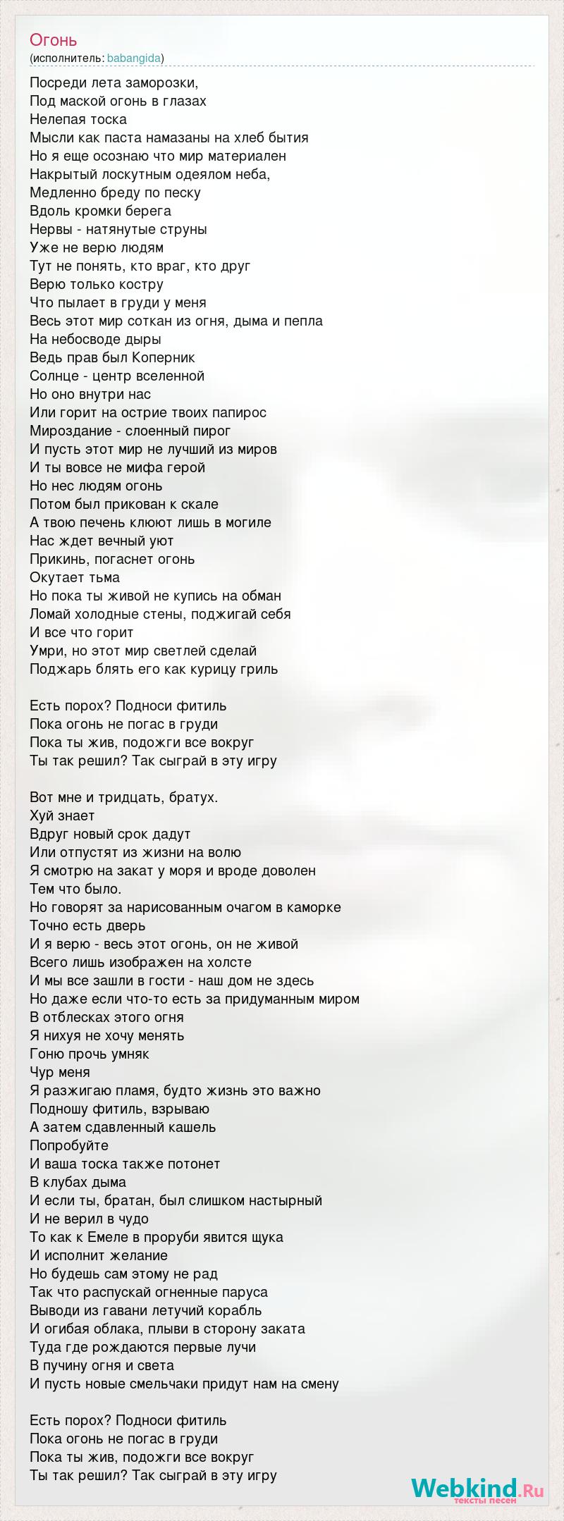 Посреди лета заморозки, Под маской огонь в глазах Нелепая тоска Мысли как паста намазаны на хлеб бытия Но я еще осознаю что мир материален Накрытый лоскутным одеялом неба, Медленно бреду по песку Вдоль кромки берега Нервы - натянутые струны Уже не верю людям Тут не понять, кто враг, кто друг Верю только костру Что пылает в груди у меня Весь этот мир соткан из огня, дыма и пепла На небосводе дыры Ведь прав был Коперник Солнце - центр вселенной Но оно внутри нас Или горит на острие твоих папирос Мироздание - слоенный пирог И пусть этот мир не лучший из миров И ты вовсе не мифа герой Но нес людям огонь Потом был прикован к скале А твою печень клюют лишь в могиле Нас ждет вечный уют Прикинь, погаснет огонь Окутает тьма Но пока ты живой не купись на обман Ломай холодные стены, поджигай себя И все что горит Умри, но этот мир светлей сделай Поджарь блять его как курицу гриль Есть порох? Подноси фитиль Пока огонь не погас в груди Пока ты жив, подожги все вокруг Ты так решил? Так сыграй в эту игру Вот мне и тридцать, братух. Хуй знает Вдруг новый срок дадут Или отпустят из жизни на волю Я смотрю на закат у моря и вроде доволен Тем что было. Но говорят за нарисованным очагом в каморке Точно есть дверь И я верю - весь этот огонь, он не живой Всего лишь изображен на холсте И мы все зашли в гости - наш дом не здесь Но даже если что-то есть за придуманным миром В отблесках этого огня Я нихуя не хочу менять Гоню прочь умняк Чур меня Я разжигаю пламя, будто жизнь это важно Подношу фитиль, взрываю А затем сдавленный кашель Попробуйте И ваша тоска также потонет В клубах дыма И если ты, братан, был слишком настырный И не верил в чудо То как к Емеле в проруби явится щука И исполнит желание Но будешь сам этому не рад Так что распускай огненные паруса Выводи из гавани летучий корабль И огибая облака, плыви в сторону заката Туда где рождаются первые лучи В пучину огня и света И пусть новые смельчаки придут нам на смену Есть порох? Подноси фитиль Пока огонь не погас в груди Пока ты жив, подожги все вокруг Ты так решил? Так сыграй в эту игру