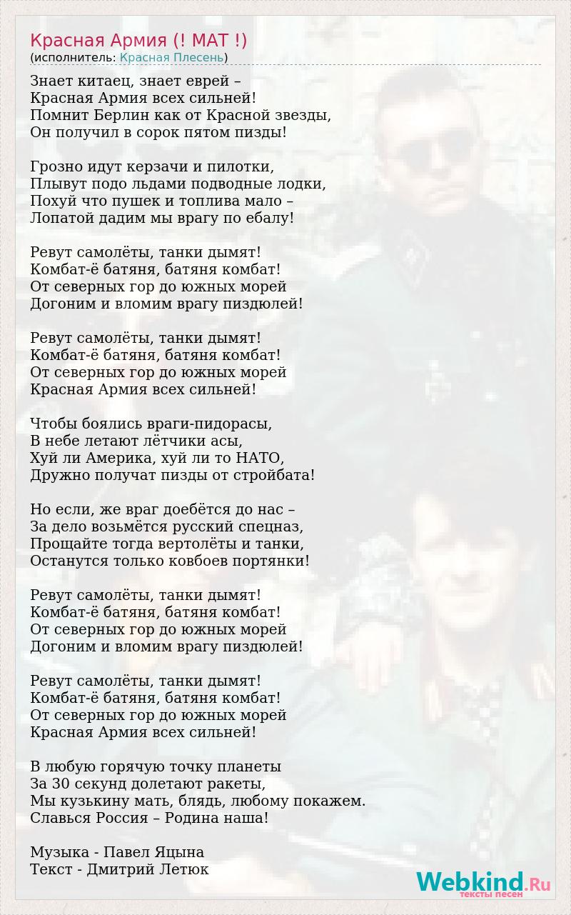 Знает китаец, знает еврей – Красная Армия всех сильней! Помнит Берлин как от Красной звезды, Он получил в сорок пятом пизды! Грозно идут керзачи и пилотки, Плывут подо льдами подводные лодки, Похуй что пушек и топлива мало – Лопатой дадим мы врагу по ебалу! Ревут самолёты, танки дымят! Комбат-ё батяня, батяня комбат! От северных гор до южных морей Догоним и вломим врагу пиздюлей! Ревут самолёты, танки дымят! Комбат-ё батяня, батяня комбат! От северных гор до южных морей Красная Армия всех сильней! Чтобы боялись враги-пидорасы, В небе летают лётчики асы, Хуй ли Америка, хуй ли то НАТО, Дружно получат пизды от стройбата! Но если, же враг доебётся до нас – За дело возьмётся русский спецназ, Прощайте тогда вертолёты и танки, Останутся только ковбоев портянки! Ревут самолёты, танки дымят! Комбат-ё батяня, батяня комбат! От северных гор до южных морей Догоним и вломим врагу пиздюлей! Ревут самолёты, танки дымят! Комбат-ё батяня, батяня комбат! От северных гор до южных морей Красная Армия всех сильней! В любую горячую точку планеты За 30 секунд долетают ракеты, Мы кузькину мать, блядь, любому покажем. Славься Россия – Родина наша! Музыка - Павел Яцына Текст - Дмитрий Летюк