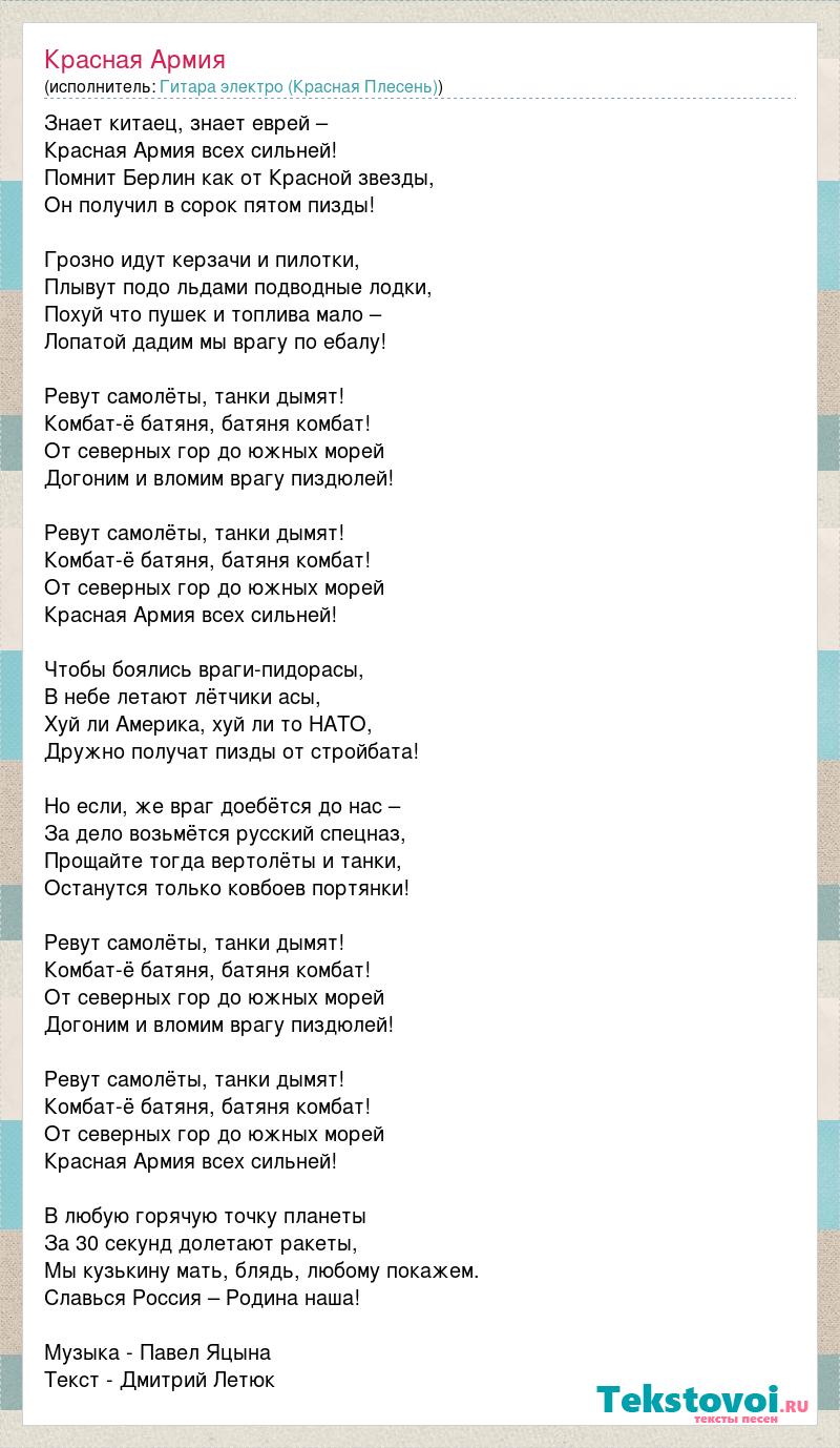 Знает китаец, знает еврей – Красная Армия всех сильней! Помнит Берлин как от Красной звезды, Он получил в сорок пятом пизды! Грозно идут керзачи и пилотки, Плывут подо льдами подводные лодки, Похуй что пушек и топлива мало – Лопатой дадим мы врагу по ебалу! Ревут самолёты, танки дымят! Комбат-ё батяня, батяня комбат! От северных гор до южных морей Догоним и вломим врагу пиздюлей! Ревут самолёты, танки дымят! Комбат-ё батяня, батяня комбат! От северных гор до южных морей Красная Армия всех сильней! Чтобы боялись враги-пидорасы, В небе летают лётчики асы, Хуй ли Америка, хуй ли то НАТО, Дружно получат пизды от стройбата! Но если, же враг доебётся до нас – За дело возьмётся русский спецназ, Прощайте тогда вертолёты и танки, Останутся только ковбоев портянки! Ревут самолёты, танки дымят! Комбат-ё батяня, батяня комбат! От северных гор до южных морей Догоним и вломим врагу пиздюлей! Ревут самолёты, танки дымят! Комбат-ё батяня, батяня комбат! От северных гор до южных морей Красная Армия всех сильней! В любую горячую точку планеты За 30 секунд долетают ракеты, Мы кузькину мать, блядь, любому покажем. Славься Россия – Родина наша! Музыка - Павел Яцына Текст - Дмитрий Летюк