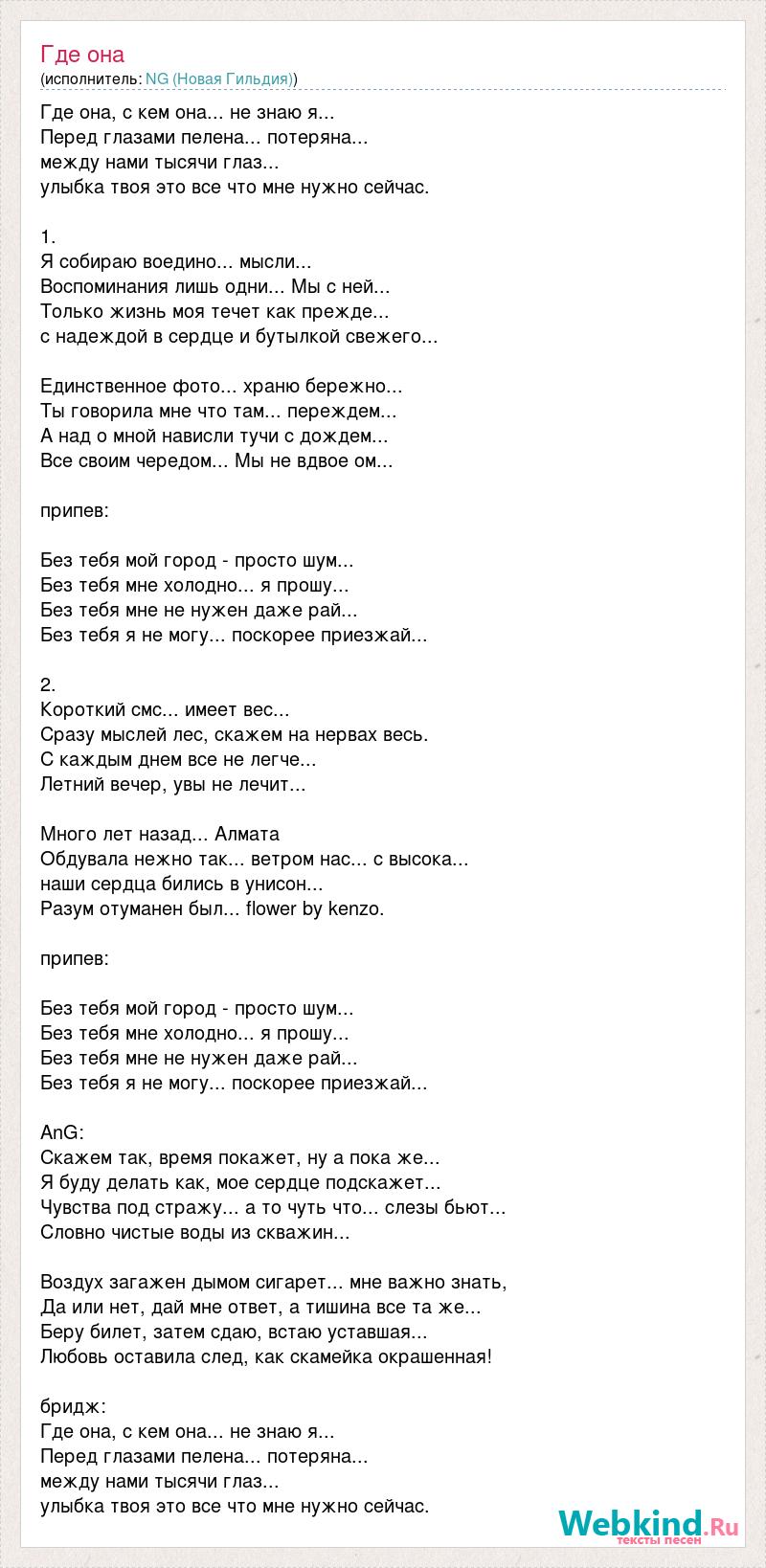 Где она, с кем она... не знаю я... Перед глазами пелена... потеряна... между нами тысячи глаз... улыбка твоя это все что мне нужно сейчас. 1. Я собираю воедино... мысли... Воспоминания лишь одни... Мы с ней... Только жизнь моя течет как прежде... с надеждой в сердце и бутылкой свежего... Единственное фото... храню бережно... Ты говорила мне что там... переждем... А над о мной нависли тучи с дождем... Все своим чередом... Мы не вдвое ом... припев: Без тебя мой город - просто шум... Без тебя мне холодно... я прошу... Без тебя мне не нужен даже рай... Без тебя я не могу... поскорее приезжай... 2. Короткий смс... имеет вес... Сразу мыслей лес, скажем на нервах весь. С каждым днем все не легче... Летний вечер, увы не лечит... Много лет назад... Алмата Обдувала нежно так... ветром нас... с высока... наши сердца бились в унисон... Разум отуманен был... flower by kenzo. припев: Без тебя мой город - просто шум... Без тебя мне холодно... я прошу... Без тебя мне не нужен даже рай... Без тебя я не могу... поскорее приезжай... AnG: Скажем так, время покажет, ну а пока же... Я буду делать как, мое сердце подскажет... Чувства под стражу... а то чуть что... слезы бьют... Словно чистые воды из скважин... Воздух загажен дымом сигарет... мне важно знать, Да или нет, дай мне ответ, а тишина все та же... Беру билет, затем сдаю, встаю уставшая... Любовь оставила след, как скамейка окрашенная! бридж: Где она, с кем она... не знаю я... Перед глазами пелена... потеряна... между нами тысячи глаз... улыбка твоя это все что мне нужно сейчас.