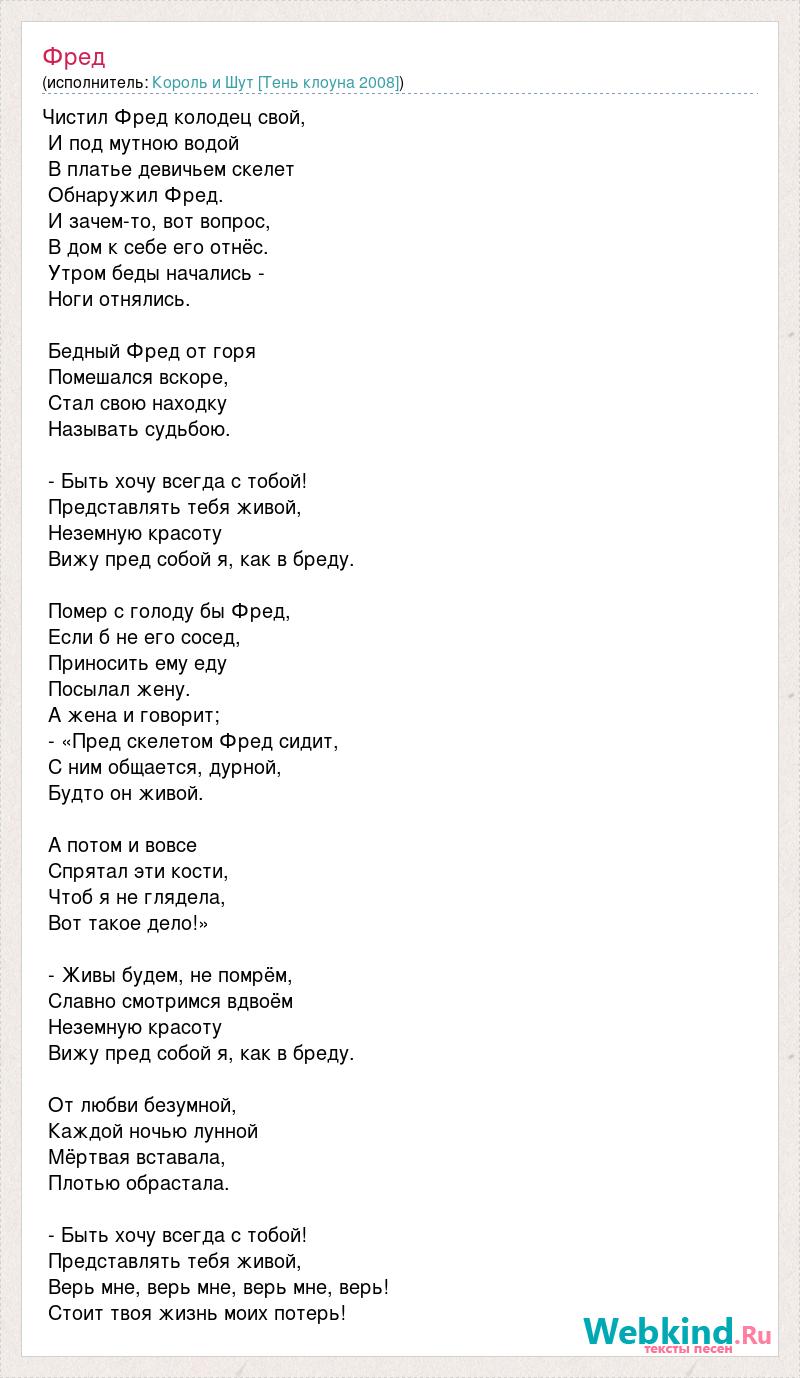 Чистил Фред колодец свой, И под мутною водой В платье девичьем скелет Обнаружил Фред. И зачем-то, вот вопрос, В дом к себе его отнёс. Утром беды начались - Ноги отнялись. Бедный Фред от горя Помешался вскоре, Стал свою находку Называть судьбою. - Быть хочу всегда с тобой! Представлять тебя живой, Неземную красоту Вижу пред собой я, как в бреду. Помер с голоду бы Фред, Если б не его сосед, Приносить ему еду Посылал жену. А жена и говорит; - «Пред скелетом Фред сидит, С ним общается, дурной, Будто он живой. А потом и вовсе Спрятал эти кости, Чтоб я не глядела, Вот такое дело!» - Живы будем, не помрём, Славно смотримся вдвоём Неземную красоту Вижу пред собой я, как в бреду. От любви безумной, Каждой ночью лунной Мёртвая вставала, Плотью обрастала. - Быть хочу всегда с тобой! Представлять тебя живой, Верь мне, верь мне, верь мне, верь! Стоит твоя жизнь моих потерь!