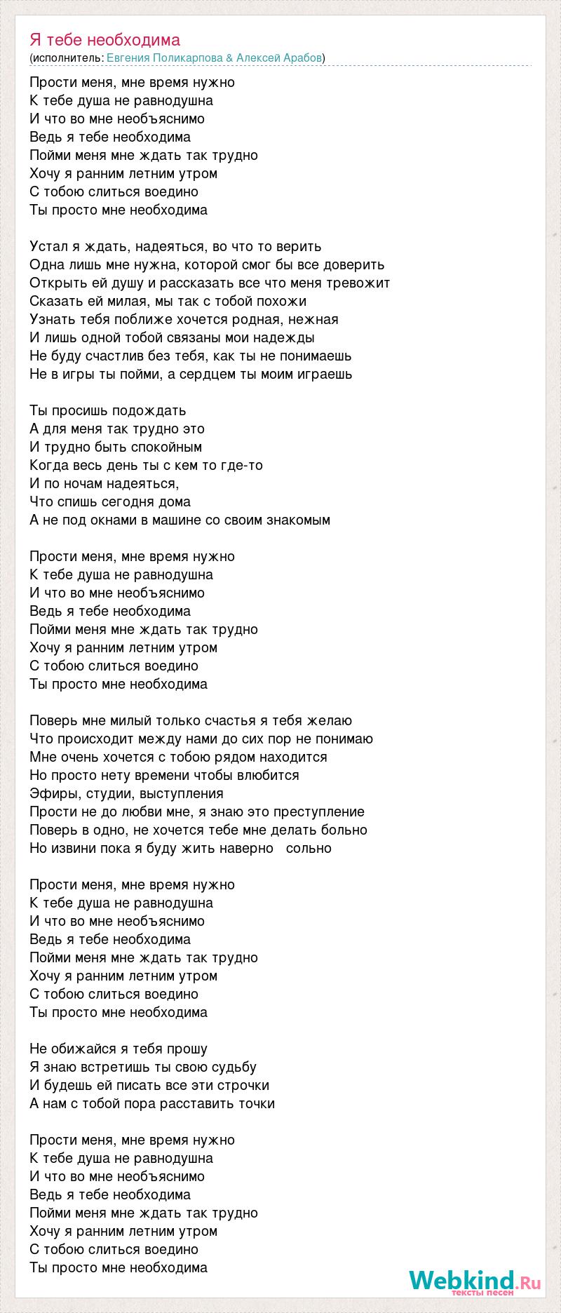 Прости меня, мне время нужно К тебе душа не равнодушна И что во мне необъяснимо Ведь я тебе необходима Пойми меня мне ждать так трудно Хочу я ранним летним утром С тобою слиться воедино Ты просто мне необходима Устал я ждать, надеяться, во что то верить Одна лишь мне нужна, которой смог бы все доверить Открыть ей душу и рассказать все что меня тревожит Сказать ей милая, мы так с тобой похожи Узнать тебя поближе хочется родная, нежная И лишь одной тобой связаны мои надежды Не буду счастлив без тебя, как ты не понимаешь Не в игры ты пойми, а сердцем ты моим играешь Ты просишь подождать А для меня так трудно это И трудно быть спокойным Когда весь день ты с кем то где-то И по ночам надеяться, Что спишь сегодня дома А не под окнами в машине со своим знакомым Прости меня, мне время нужно К тебе душа не равнодушна И что во мне необъяснимо Ведь я тебе необходима Пойми меня мне ждать так трудно Хочу я ранним летним утром С тобою слиться воедино Ты просто мне необходима Поверь мне милый только счастья я тебя желаю Что происходит между нами до сих пор не понимаю Мне очень хочется с тобою рядом находится Но просто нету времени чтобы влюбится Эфиры, студии, выступления Прости не до любви мне, я знаю это преступление Поверь в одно, не хочется тебе мне делать больно Но извини пока я буду жить наверно сольно Прости меня, мне время нужно К тебе душа не равнодушна И что во мне необъяснимо Ведь я тебе необходима Пойми меня мне ждать так трудно Хочу я ранним летним утром С тобою слиться воедино Ты просто мне необходима Не обижайся я тебя прошу Я знаю встретишь ты свою судьбу И будешь ей писать все эти строчки А нам с тобой пора расставить точки Прости меня, мне время нужно К тебе душа не равнодушна И что во мне необъяснимо Ведь я тебе необходима Пойми меня мне ждать так трудно Хочу я ранним летним утром С тобою слиться воедино Ты просто мне необходима