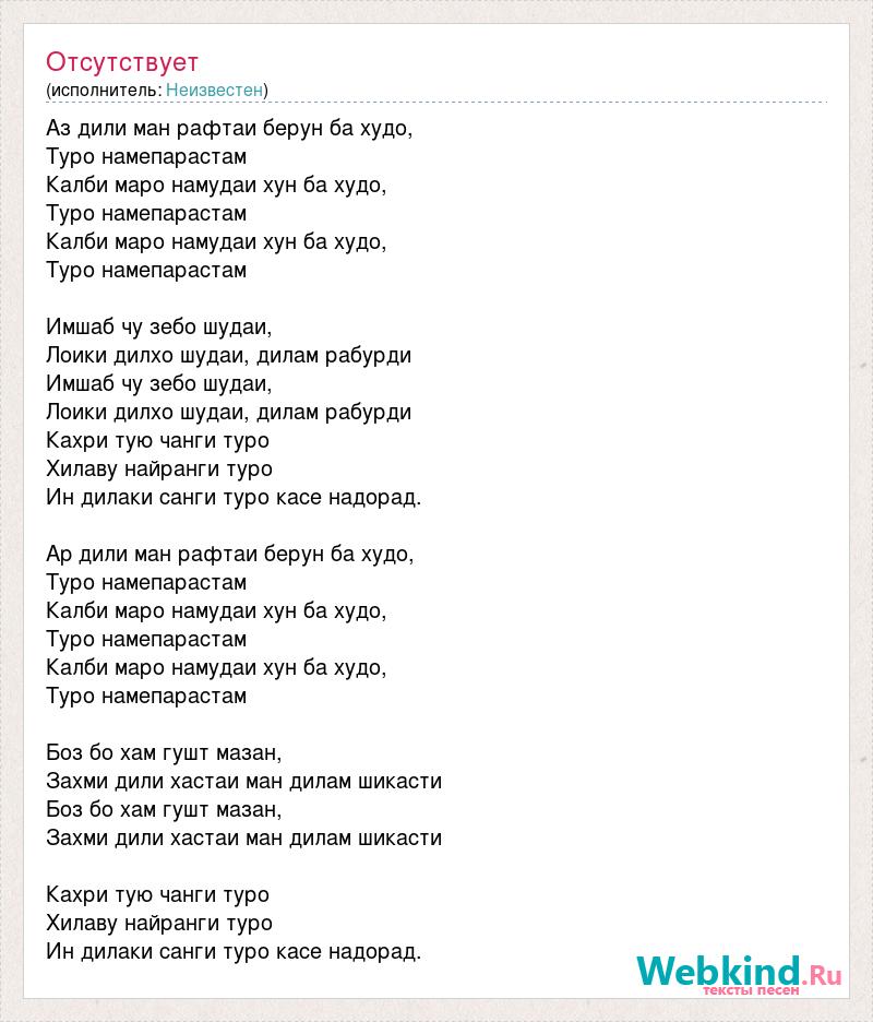 Aз дили ман рафтаи берун ба худо, Туро намепарастам Калби маро намудаи хун ба худо, Туро намепарастам Калби маро намудаи хун ба худо, Туро намепарастам Имшаб чу зебо шудаи, Лоики дилхо шудаи, дилам рабурди Имшаб чу зебо шудаи, Лоики дилхо шудаи, дилам рабурди Кахри тую чанги туро Хилаву найранги туро Ин дилаки санги туро касе надорад. Ap дили ман рафтаи берун ба худо, Туро намепарастам Калби маро намудаи хун ба худо, Туро намепарастам Калби маро намудаи хун ба худо, Туро намепарастам Боз бо хам гушт мазан, Захми дили хастаи ман дилам шикасти Боз бо хам гушт мазан, Захми дили хастаи ман дилам шикасти Кахри тую чанги туро Хилаву найранги туро Ин дилаки санги туро касе надорад.