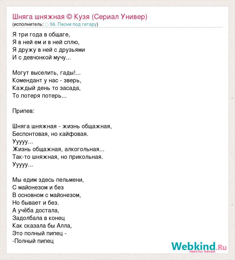 Я три года в общаге, Я в ней ем и в ней сплю, Я дружу в ней с друзьями И с девчонкой мучу... Могут выселить, гады!... Комендант у нас - зверь, Каждый день то засада, То потеря потерь... Припев: Шняга шняжная - жизнь общажная, Беспонтовая, но кайфовая. Ууууу... Жизнь общажная, алкогольная... Так-то шняжная, но прикольная. Ууууу... Мы едим здесь пельмени, С майонезом и без В основном с майонезом, Но бывает и без. А учёба достала, Задолбала в конец Как сказала бы Алла, Это полный пипец - -Полный пипец