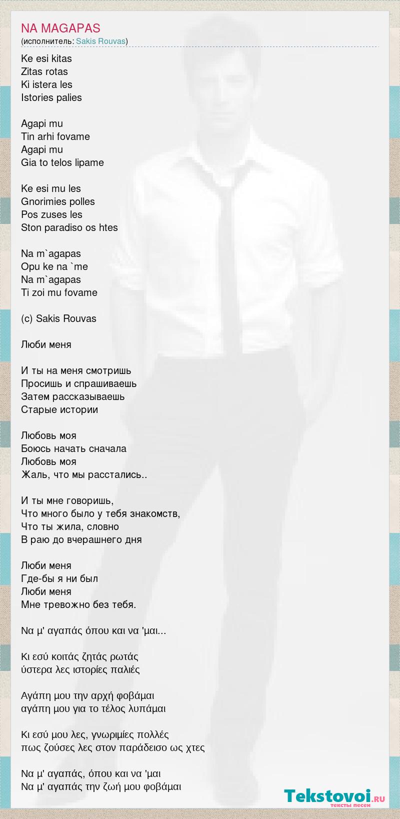Ke esi kitas Zitas rotas Ki istera les Istories palies Agapi mu Tin arhi fovame Agapi mu Gia to telos lipame Ke esi mu les Gnorimies polles Pos zuses les Ston paradiso os htes Na m`agapas Opu ke na `me Na m`agapas Ti zoi mu fovame (c) Sakis Rouvas Люби меня И ты на меня смотришь Просишь и спрашиваешь Затем рассказываешь Старые истории Любовь моя Боюсь начать сначала Любовь моя Жаль, что мы расстались.. И ты мне говоришь, Что много было у тебя знакомств, Что ты жила, словно В раю до вчерашнего дня Люби меня Где-бы я ни был Люби меня Мне тревожно без тебя. Να μ' αγαπάς όπου και να 'μαι... Κι εσύ κοιτάς ζητάς ρωτάς ύστερα λες ιστορίες παλιές Αγάπη μου την αρχή φοβάμαι αγάπη μου για το τέλος λυπάμαι Κι εσύ μου λες, γνωριμίες πολλές πως ζούσες λες στον παράδεισο ως χτες Να μ' αγαπάς, όπου και να 'μαι Να μ' αγαπάς την ζωή μου φοβάμαι