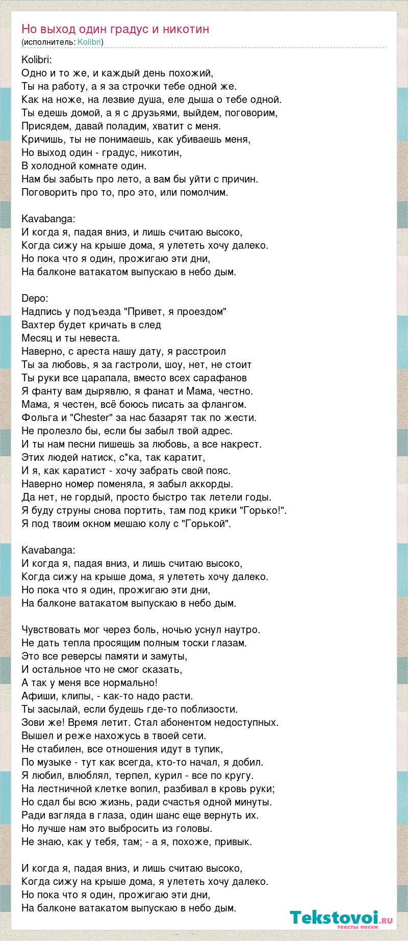 Kolibri: Одно и то же, и каждый день похожий, Ты на работу, а я за строчки тебе одной же. Как на ноже, на лезвие душа, еле дыша о тебе одной. Ты едешь домой, а я с друзьями, выйдем, поговорим, Присядем, давай поладим, хватит с меня. Кричишь, ты не понимаешь, как убиваешь меня, Но выход один - градус, никотин, В холодной комнате один. Нам бы забыть про лето, а вам бы уйти с причин. Поговорить про то, про это, или помолчим. Kavabanga: И когда я, падая вниз, и лишь считаю высоко, Когда сижу на крыше дома, я улететь хочу далеко. Но пока что я один, прожигаю эти дни, На балконе ватакатом выпускаю в небо дым. Depo: Надпись у подъезда "Привет, я проездом" Вахтер будет кричать в след Месяц и ты невеста. Наверно, с ареста нашу дату, я расстроил Ты за любовь, я за гастроли, шоу, нет, не стоит Ты руки все царапала, вместо всех сарафанов Я фанту вам дырявлю, я фанат и Мама, честно. Мама, я честен, всё боюсь писать за флангом. Фольга и "Chester" за нас базарят так по жести. Не пролезло бы, если бы забыл твой адрес. И ты нам песни пишешь за любовь, а все накрест. Этих людей натиск, с*ка, так каратит, И я, как каратист - хочу забрать свой пояс. Наверно номер поменяла, я забыл аккорды. Да нет, не гордый, просто быстро так летели годы. Я буду струны снова портить, там под крики "Горько!". Я под твоим окном мешаю колу с "Горькой". Kavabanga: И когда я, падая вниз, и лишь считаю высоко, Когда сижу на крыше дома, я улететь хочу далеко. Но пока что я один, прожигаю эти дни, На балконе ватакатом выпускаю в небо дым. Чувствовать мог через боль, ночью уснул наутро. Не дать тепла просящим полным тоски глазам. Это все реверсы памяти и замуты, И остальное что не смог сказать, А так у меня все нормально! Афиши, клипы, - как-то надо расти. Ты засылай, если будешь где-то поблизости. Зови же! Время летит. Стал абонентом недоступных. Вышел и реже нахожусь в твоей сети. Не стабилен, все отношения идут в тупик, По музыке - тут как всегда, кто-то начал, я добил. Я любил, влюблял, терпел, курил - все по кругу. На лестничной клетке вопил, разбивал в кровь руки; Но сдал бы всю жизнь, ради счастья одной минуты. Ради взгляда в глаза, один шанс еще вернуть их. Но лучше нам это выбросить из головы. Не знаю, как у тебя, там; - а я, похоже, привык. И когда я, падая вниз, и лишь считаю высоко, Когда сижу на крыше дома, я улететь хочу далеко. Но пока что я один, прожигаю эти дни, На балконе ватакатом выпускаю в небо дым.