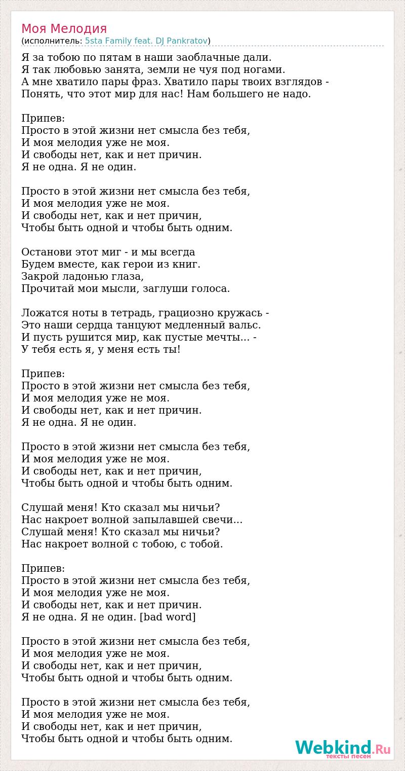 Я за тобою по пятам в наши заоблачные дали. Я так любовью занята, земли не чуя под ногами. А мне хватило пары фраз. Хватило пары твоих взглядов - Понять, что этот мир для нас! Нам большего не надо. Припев: Просто в этой жизни нет смысла без тебя, И моя мелодия уже не моя. И свободы нет, как и нет причин. Я не одна. Я не один. Просто в этой жизни нет смысла без тебя, И моя мелодия уже не моя. И свободы нет, как и нет причин, Чтобы быть одной и чтобы быть одним. Останови этот миг - и мы всегда Будем вместе, как герои из книг. Закрой ладонью глаза, Прочитай мои мысли, заглуши голоса. Ложатся ноты в тетрадь, грациозно кружась - Это наши сердца танцуют медленный вальс. И пусть рушится мир, как пустые мечты... - У тебя есть я, у меня есть ты! Припев: Просто в этой жизни нет смысла без тебя, И моя мелодия уже не моя. И свободы нет, как и нет причин. Я не одна. Я не один. Просто в этой жизни нет смысла без тебя, И моя мелодия уже не моя. И свободы нет, как и нет причин, Чтобы быть одной и чтобы быть одним. Слушай меня! Кто сказал мы ничьи? Нас накроет волной запылавшей свечи... Слушай меня! Кто сказал мы ничьи? Нас накроет волной с тобою, с тобой. Припев: Просто в этой жизни нет смысла без тебя, И моя мелодия уже не моя. И свободы нет, как и нет причин. Я не одна. Я не один. [bad word] Просто в этой жизни нет смысла без тебя, И моя мелодия уже не моя. И свободы нет, как и нет причин, Чтобы быть одной и чтобы быть одним. Просто в этой жизни нет смысла без тебя, И моя мелодия уже не моя. И свободы нет, как и нет причин, Чтобы быть одной и чтобы быть одним.