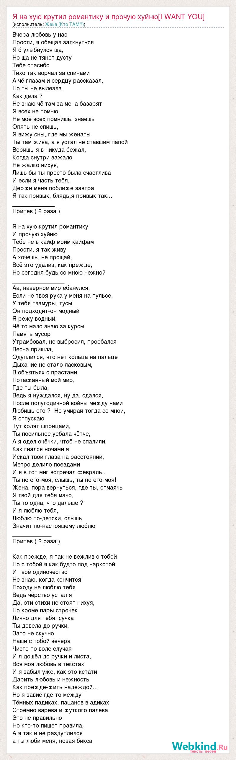 Вчера любовь у нас Прости, я обещал заткнуться Я б улыбнулся ща, Но ща не тянет дусту Тебе спасибо Тихо так ворчал за спинами А чё глазам и сердцу рассказал, Но ты не вылезла Как дела ? Не знаю чё там за мена базарят Я всех не помню, Не моё всех помнишь, знаешь Опять не спишь, Я вижу сны, где мы женаты Ты там жива, а я устал не ставшим папой Веришь-я в никуда бежал, Когда снутри зажало Не жалко нихуя, Лишь бы ты просто была счастлива И если я часть тебя, Держи меня поближе завтра Я так привык, блядь,я привык так... _____________ Припев ( 2 раза ) Я на хую крутил романтику И прочую хуйню Тебе не в кайф моим кайфам Прости, я так живу А хочешь, не прощай, Всё это удалив, как прежде, Но сегодня будь со мною нежной ________________ Аа, наверное мир ебанулся, Если не твоя рука у меня на пульсе, У тебя гламуры, тусы Он подходит-он модный Я режу водный, Чё то мало знаю за курсы Память мусор Утрамбовал, не выбросил, проебался Весна пришла, Одуплился, что нет кольца на пальце Дыхание не стало ласковым, В объятьях с прастами, Потасканный мой мир, Где ты была, Ведь я нуждался, ну да, сдался, После полугодичной войны между нами Любишь его ? -Не умирай тогда со мной, Я отпускаю Тут колят шприцами, Ты посильнее уебала чётче, А я одел очёчки, чтоб не спалили, Как гнался ночами я Искал твои глаза на расстоянии, Метро делило поездами И я в тот миг встречал февраль.. Ты не его-моя, слышь, ты не его-моя! Жена. пора вернуться, где ты, отмаячь Я твой для тебя мачо, Ты то одна, что дальше ? И я люблю тебя, Люблю по-детски, слышь Значит по-настоящему люблю ____________ Припев ( 2 раза ) ____________ Как прежде, я так не вежлив с тобой Но с тобой я как будто под наркотой И твоё одиночество Не знаю, когда кончится Походу не люблю тебя Ведь чёрство устал я Да, эти стихи не стоят нихуя, Но кроме пары строчек Лично для тебя, сучка Ты довела до ручки, Зато не скучно Наши с тобой вечера Чисто по воле случая И я дошёл до ручки и листа, Вся моя любовь в текстах И я забыл уже, как это кстати Дарить любовь и нежность Как прежде-жить надеждой... Но я завис где-то между Тёмных падиках, пацанов в адиках Стрёмно варева и жуткого палева Это не правильно Но кто-то пишет правила, А я так и не раздуплился а ты люби меня, новая бикса