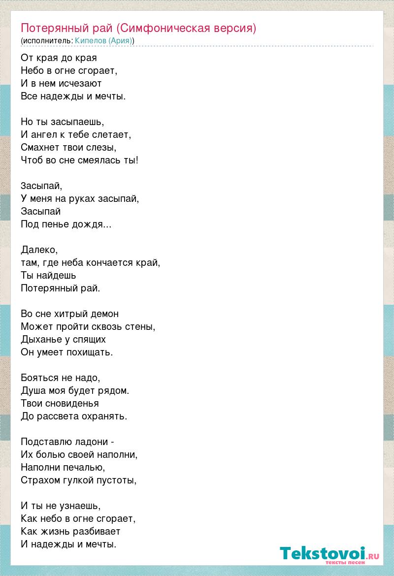 От края до края Небо в огне сгорает, И в нем исчезают Все надежды и мечты. Но ты засыпаешь, И ангел к тебе слетает, Смахнет твои слезы, Чтоб во сне смеялась ты! 3асыпай, У меня на руках засыпай, Засыпай Под пенье дождя... Далеко, там, где неба кончается край, Ты найдешь Потерянный рай. Во сне хитрый демон Может пройти сквозь стены, Дыханье у спящих Он умеет похищать. Бояться не надо, Душа моя будет рядом. Твои сновиденья До рассвета охранять. Подставлю ладони - Их болью своей наполни, Наполни печалью, Страхом гулкой пустоты, И ты не узнаешь, Как небо в огне сгорает, Как жизнь разбивает И надежды и мечты.