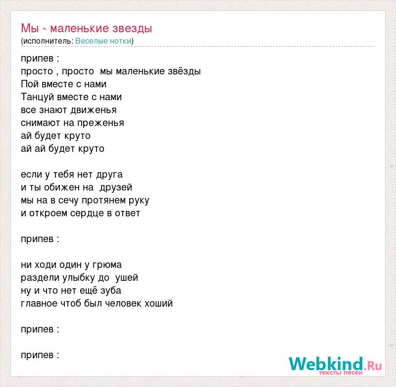 припев : просто , просто мы маленькие звёзды Пой вместе с нами Танцуй вместе с нами все знают движенья снимают на преженья ай будет круто ай ай будет круто если у тебя нет друга и ты обижен на друзей мы на в сечу протянем руку и откроем сердце в ответ припев : ни ходи один у грюма раздели улыбку до ушей ну и что нет ещё зуба главное чтоб был человек хоший припев : припев :