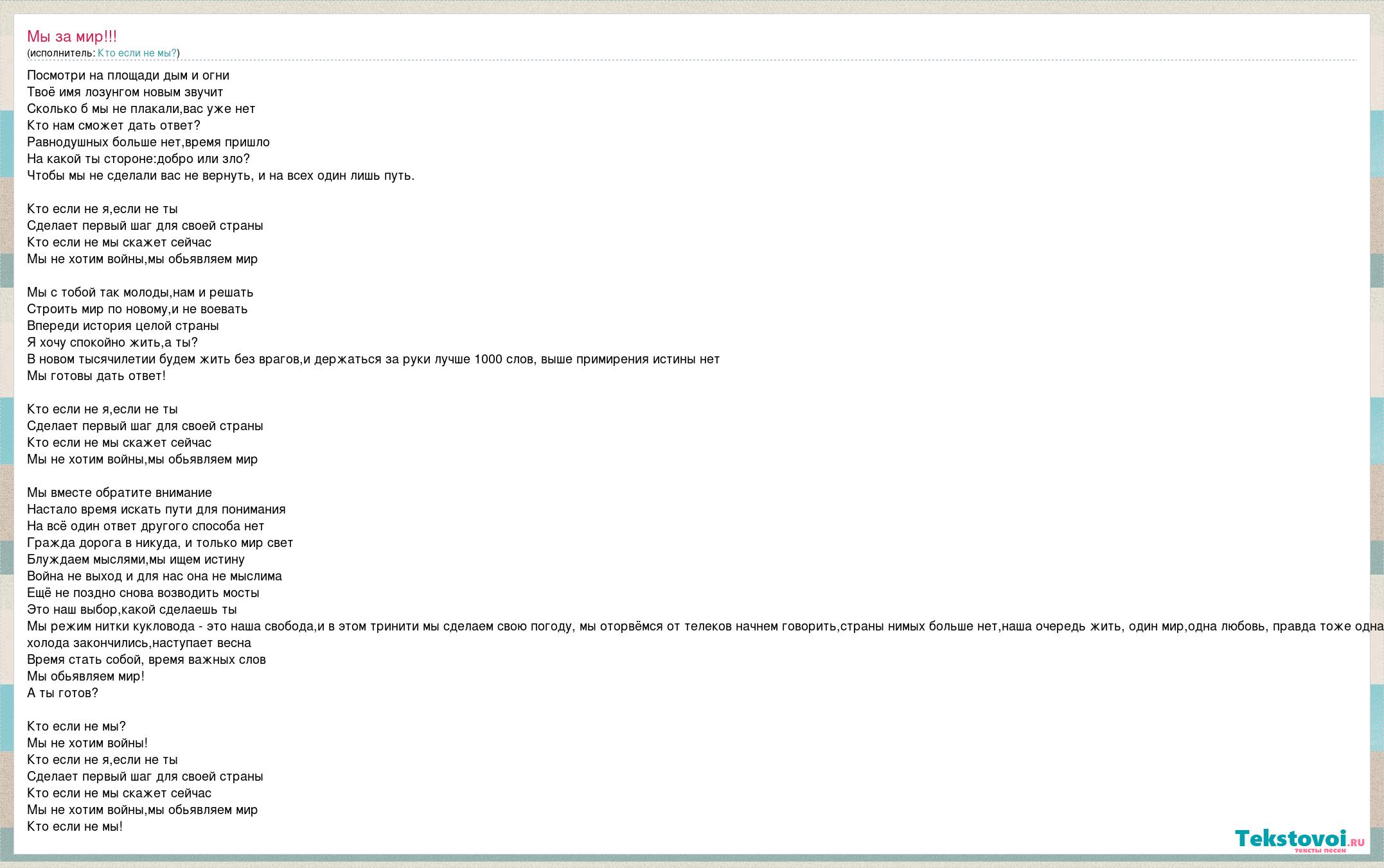 Посмотри на площади дым и огни Твоё имя лозунгом новым звучит Сколько б мы не плакали,вас уже нет Кто нам сможет дать ответ? Равнодушных больше нет,время пришло На какой ты стороне:добро или зло? Чтобы мы не сделали вас не вернуть, и на всех один лишь путь. Кто если не я,если не ты Сделает первый шаг для своей страны Кто если не мы скажет сейчас Мы не хотим войны,мы обьявляем мир Мы с тобой так молоды,нам и решать Строить мир по новому,и не воевать Впереди история целой страны Я хочу спокойно жить,а ты? В новом тысячилетии будем жить без врагов,и держаться за руки лучше 1000 слов, выше примирения истины нет Мы готовы дать ответ! Кто если не я,если не ты Сделает первый шаг для своей страны Кто если не мы скажет сейчас Мы не хотим войны,мы обьявляем мир Мы вместе обратите внимание Настало время искать пути для понимания На всё один ответ другого способа нет Гражда дорога в никуда, и только мир свет Блуждаем мыслями,мы ищем истину Война не выход и для нас она не мыслима Ещё не поздно снова возводить мосты Это наш выбор,какой сделаешь ты Мы режим нитки кукловода - это наша свобода,и в этом тринити мы сделаем свою погоду, мы оторвёмся от телеков начнем говорить,страны нимых больше нет,наша очередь жить, один мир,одна любовь, правда тоже одна холода закончились,наступает весна Время стать собой, время важных слов Мы обьявляем мир! А ты готов? Кто если не мы? Мы не хотим войны! Кто если не я,если не ты Сделает первый шаг для своей страны Кто если не мы скажет сейчас Мы не хотим войны,мы обьявляем мир Кто если не мы!
