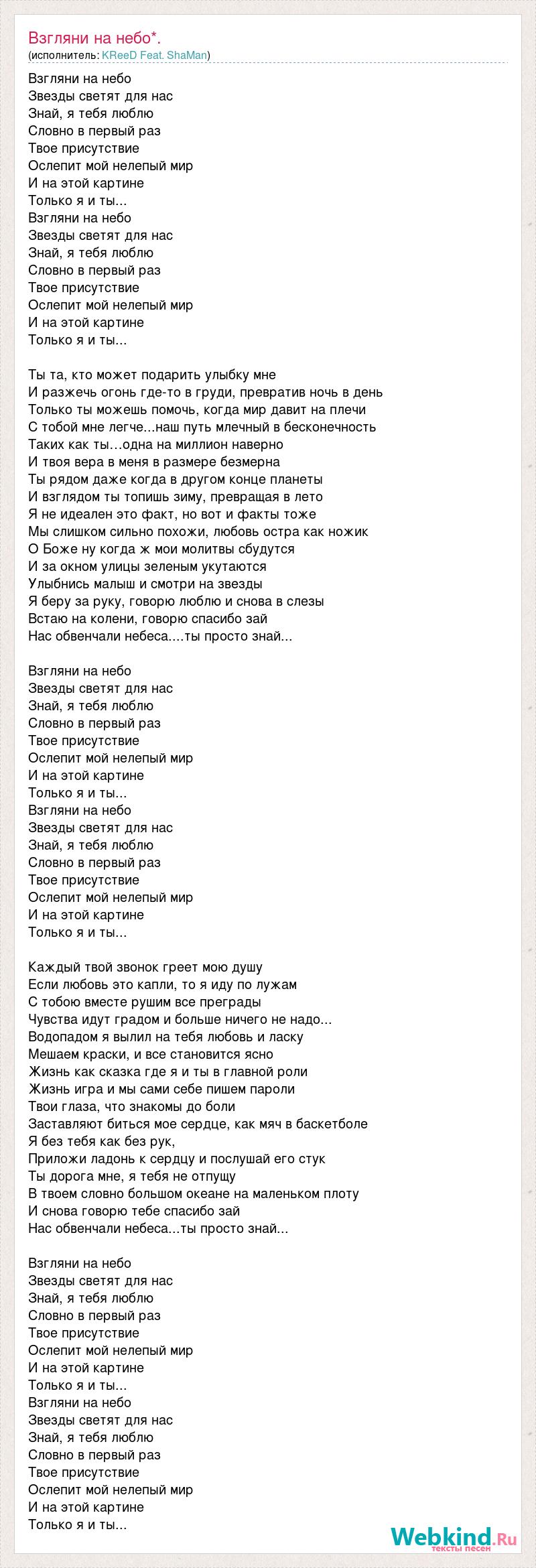 Взгляни на небо Звезды светят для нас Знай, я тебя люблю Словно в первый раз Твое присутствие Ослепит мой нелепый мир И на этой картине Только я и ты... Взгляни на небо Звезды светят для нас Знай, я тебя люблю Словно в первый раз Твое присутствие Ослепит мой нелепый мир И на этой картине Только я и ты... Ты та, кто может подарить улыбку мне И разжечь огонь где-то в груди, превратив ночь в день Только ты можешь помочь, когда мир давит на плечи С тобой мне легче...наш путь млечный в бесконечность Таких как ты…одна на миллион наверно И твоя вера в меня в размере безмерна Ты рядом даже когда в другом конце планеты И взглядом ты топишь зиму, превращая в лето Я не идеален это факт, но вот и факты тоже Мы слишком сильно похожи, любовь остра как ножик О Боже ну когда ж мои молитвы сбудутся И за окном улицы зеленым укутаются Улыбнись малыш и смотри на звезды Я беру за руку, говорю люблю и снова в слезы Встаю на колени, говорю спасибо зай Нас обвенчали небеса....ты просто знай... Взгляни на небо Звезды светят для нас Знай, я тебя люблю Словно в первый раз Твое присутствие Ослепит мой нелепый мир И на этой картине Только я и ты... Взгляни на небо Звезды светят для нас Знай, я тебя люблю Словно в первый раз Твое присутствие Ослепит мой нелепый мир И на этой картине Только я и ты... Каждый твой звонок греет мою душу Если любовь это капли, то я иду по лужам С тобою вместе рушим все преграды Чувства идут градом и больше ничего не надо... Водопадом я вылил на тебя любовь и ласку Мешаем краски, и все становится ясно Жизнь как сказка где я и ты в главной роли Жизнь игра и мы сами себе пишем пароли Твои глаза, что знакомы до боли Заставляют биться мое сердце, как мяч в баскетболе Я без тебя как без рук, Приложи ладонь к сердцу и послушай его стук Ты дорога мне, я тебя не отпущу В твоем словно большом океане на маленьком плоту И снова говорю тебе спасибо зай Нас обвенчали небеса...ты просто знай... Взгляни на небо Звезды светят для нас Знай, я тебя люблю Словно в первый раз Твое присутствие Ослепит мой нелепый мир И на этой картине Только я и ты... Взгляни на небо Звезды светят для нас Знай, я тебя люблю Словно в первый раз Твое присутствие Ослепит мой нелепый мир И на этой картине Только я и ты...