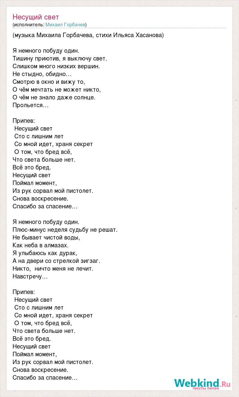 (музыка Михаила Горбачева, стихи Ильяса Хасанова) Я немного побуду один. Тишину приютив, я выключу свет. Слишком много низких вершин. Не стыдно, обидно… Смотрю в окно и вижу то, О чём мечтать не может никто, О чём не знало даже солнце. Прольется… Припев: Несущий свет Сто с лишним лет Со мной идет, храня секрет О том, что бред всё, Что света больше нет. Всё это бред. Несущий свет Поймал момент, Из рук сорвал мой пистолет. Снова воскресение. Спасибо за спасение… Я немного побуду один. Плюс-минус неделя судьбу не решат. Не бывает чистой воды, Как неба в алмазах. Я улыбаюсь как дурак, А на двери со стрелкой зигзаг. Никто, ничто меня не лечит. Навстречу… Припев: Несущий свет Сто с лишним лет Со мной идет, храня секрет О том, что бред всё, Что света больше нет. Всё это бред. Несущий свет Поймал момент, Из рук сорвал мой пистолет. Снова воскресение. Спасибо за спасение…