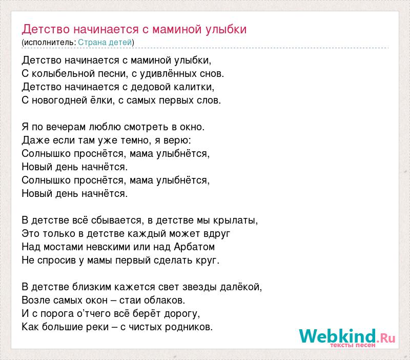 Детство начинается с маминой улыбки, С колыбельной песни, с удивлённых снов. Детство начинается с дедовой калитки, С новогодней ёлки, с самых первых слов. Я по вечерам люблю смотреть в окно. Даже если там уже темно, я верю: Солнышко проснётся, мама улыбнётся, Новый день начнётся. Солнышко проснётся, мама улыбнётся, Новый день начнётся. В детстве всё сбывается, в детстве мы крылаты, Это только в детстве каждый может вдруг Над мостами невскими или над Арбатом Не спросив у мамы первый сделать круг. В детстве близким кажется свет звезды далёкой, Возле самых окон – стаи облаков. И с порога о’тчего всё берёт дорогу, Как большие реки – с чистых родников.