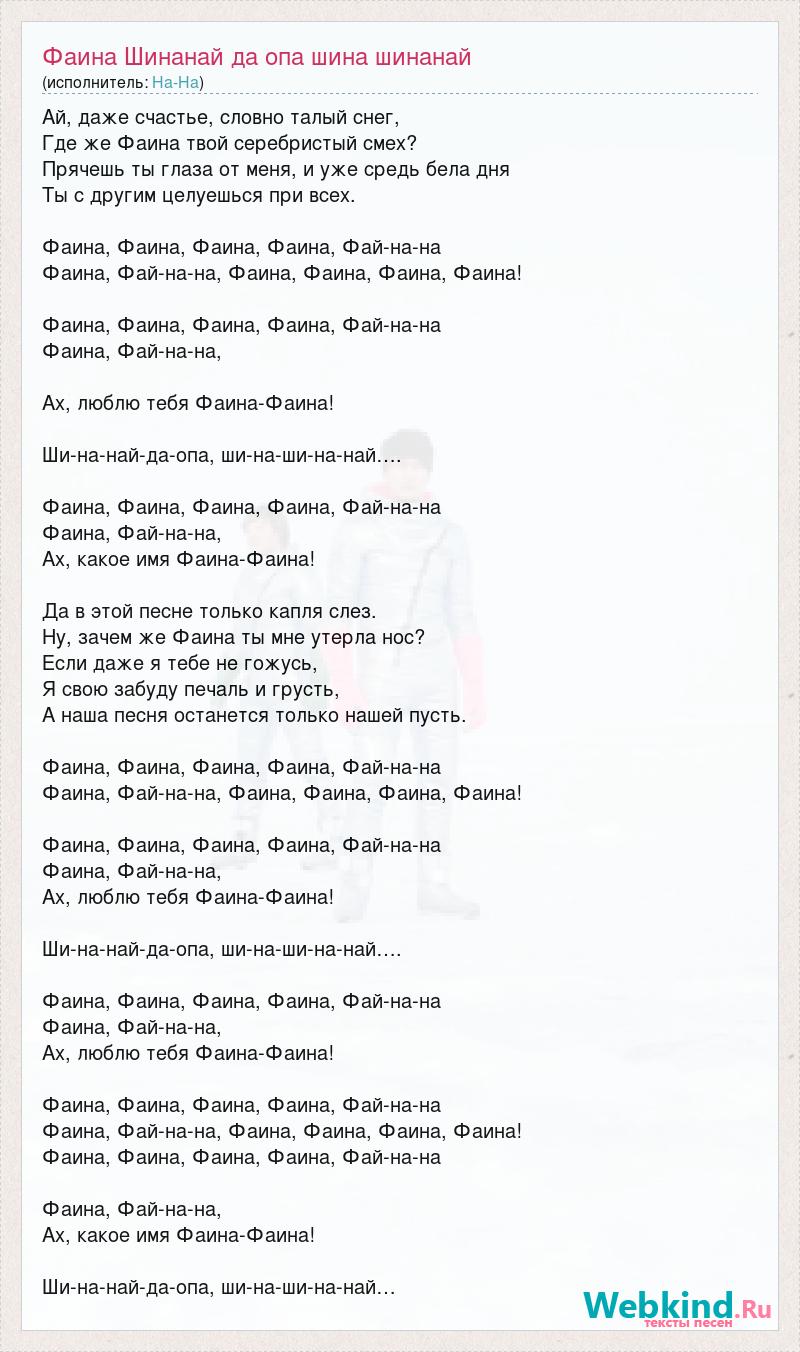 Ай, даже счастье, словно талый снег, Где же Фаина твой серебристый смех? Прячешь ты глаза от меня, и уже средь бела дня Ты с другим целуешься при всех. Фаина, Фаина, Фаина, Фаина, Фай-на-на Фаина, Фай-на-на, Фаина, Фаина, Фаина, Фаина! Фаина, Фаина, Фаина, Фаина, Фай-на-на Фаина, Фай-на-на, Ах, люблю тебя Фаина-Фаина! Ши-на-най-да-опа, ши-на-ши-на-най…. Фаина, Фаина, Фаина, Фаина, Фай-на-на Фаина, Фай-на-на, Ах, какое имя Фаина-Фаина! Да в этой песне только капля слез. Ну, зачем же Фаина ты мне утерла нос? Если даже я тебе не гожусь, Я свою забуду печаль и грусть, А наша песня останется только нашей пусть. Фаина, Фаина, Фаина, Фаина, Фай-на-на Фаина, Фай-на-на, Фаина, Фаина, Фаина, Фаина! Фаина, Фаина, Фаина, Фаина, Фай-на-на Фаина, Фай-на-на, Ах, люблю тебя Фаина-Фаина! Ши-на-най-да-опа, ши-на-ши-на-най…. Фаина, Фаина, Фаина, Фаина, Фай-на-на Фаина, Фай-на-на, Ах, люблю тебя Фаина-Фаина! Фаина, Фаина, Фаина, Фаина, Фай-на-на Фаина, Фай-на-на, Фаина, Фаина, Фаина, Фаина! Фаина, Фаина, Фаина, Фаина, Фай-на-на Фаина, Фай-на-на, Ах, какое имя Фаина-Фаина! Ши-на-най-да-опа, ши-на-ши-на-най…