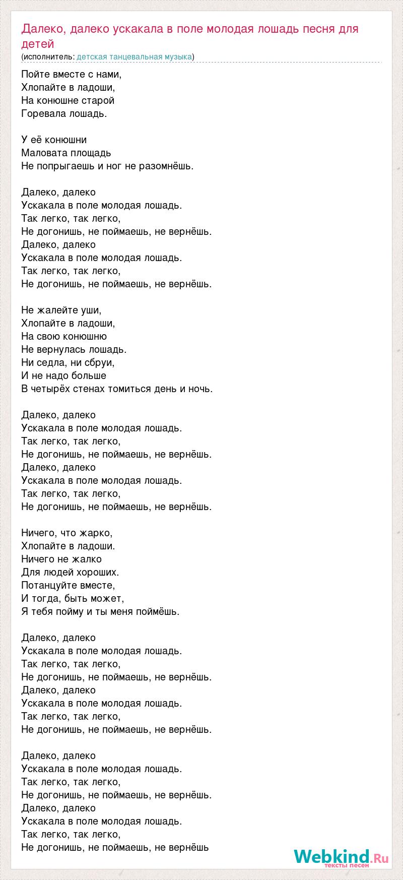 Пойте вместе с нами, Хлопайте в ладоши, На конюшне старой Горевала лошадь. У её конюшни Маловата площадь Не попрыгаешь и ног не разомнёшь. Далеко, далеко Ускакала в поле молодая лошадь. Так легко, так легко, Не догонишь, не поймаешь, не вернёшь. Далеко, далеко Ускакала в поле молодая лошадь. Так легко, так легко, Не догонишь, не поймаешь, не вернёшь. Не жалейте уши, Хлопайте в ладоши, На свою конюшню Не вернулась лошадь. Ни седла, ни сбруи, И не надо больше В четырёх стенах томиться день и ночь. Далеко, далеко Ускакала в поле молодая лошадь. Так легко, так легко, Не догонишь, не поймаешь, не вернёшь. Далеко, далеко Ускакала в поле молодая лошадь. Так легко, так легко, Не догонишь, не поймаешь, не вернёшь. Ничего, что жарко, Хлопайте в ладоши. Ничего не жалко Для людей хороших. Потанцуйте вместе, И тогда, быть может, Я тебя пойму и ты меня поймёшь. Далеко, далеко Ускакала в поле молодая лошадь. Так легко, так легко, Не догонишь, не поймаешь, не вернёшь. Далеко, далеко Ускакала в поле молодая лошадь. Так легко, так легко, Не догонишь, не поймаешь, не вернёшь. Далеко, далеко Ускакала в поле молодая лошадь. Так легко, так легко, Не догонишь, не поймаешь, не вернёшь. Далеко, далеко Ускакала в поле молодая лошадь. Так легко, так легко, Не догонишь, не поймаешь, не вернёшь