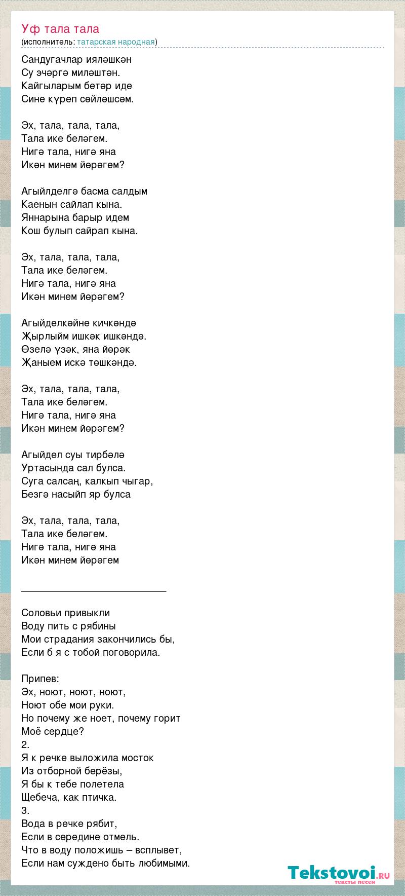 Сандугачлар ияләшкән Су эчәргә миләштән. Кайгыларым бетәр иде Сине күреп сөйләшсәм. Эх, тала, тала, тала, Тала ике беләгем. Нигә тала, нигә яна Икән минем йөрәгем? Агыйлделгә басма салдым Каенын сайлап кына. Яннарына барыр идем Кош булып сайрап кына. Эх, тала, тала, тала, Тала ике беләгем. Нигә тала, нигә яна Икән минем йөрәгем? Агыйделкәйне кичкәндә Җырлыйм ишкәк ишкәндә. Өзелә үзәк, яна йөрәк Җаныем искә төшкәндә. Эх, тала, тала, тала, Тала ике беләгем. Нигә тала, нигә яна Икән минем йөрәгем? Агыйдел суы тирбәлә Уртасында сал булса. Суга салсаң, калкып чыгар, Безгә насыйп яр булса Эх, тала, тала, тала, Тала ике беләгем. Нигә тала, нигә яна Икән минем йөрәгем __________________________ Соловьи привыкли Воду пить с рябины Мои страдания закончились бы, Если б я с тобой поговорила. Припев: Эх, ноют, ноют, ноют, Ноют обе мои руки. Но почему же ноет, почему горит Моё сердце? 2. Я к речке выложила мосток Из отборной берёзы, Я бы к тебе полетела Щебеча, как птичка. 3. Вода в речке рябит, Если в середине отмель. Что в воду положишь – всплывет, Если нам суждено быть любимыми.