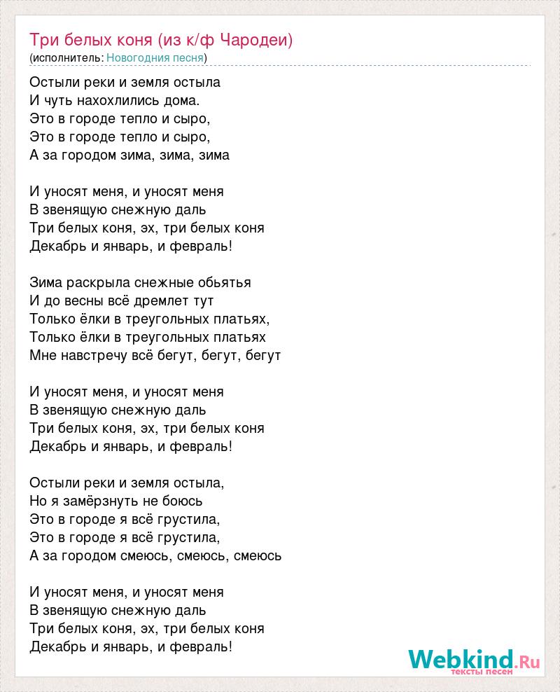 Остыли реки и земля остыла И чуть нахохлились дома. Это в городе тепло и сыро, Это в городе тепло и сыро, А за городом зима, зима, зима И уносят меня, и уносят меня В звенящую снежную даль Три белых коня, эх, три белых коня Декабрь и январь, и февраль! Зима раскрыла снежные обьятья И до весны всё дремлет тут Только ёлки в треугольных платьях, Только ёлки в треугольных платьях Мне навстречу всё бегут, бегут, бегут И уносят меня, и уносят меня В звенящую снежную даль Три белых коня, эх, три белых коня Декабрь и январь, и февраль! Остыли реки и земля остыла, Но я замёрзнуть не боюсь Это в городе я всё грустила, Это в городе я всё грустила, А за городом смеюсь, смеюсь, смеюсь И уносят меня, и уносят меня В звенящую снежную даль Три белых коня, эх, три белых коня Декабрь и январь, и февраль!