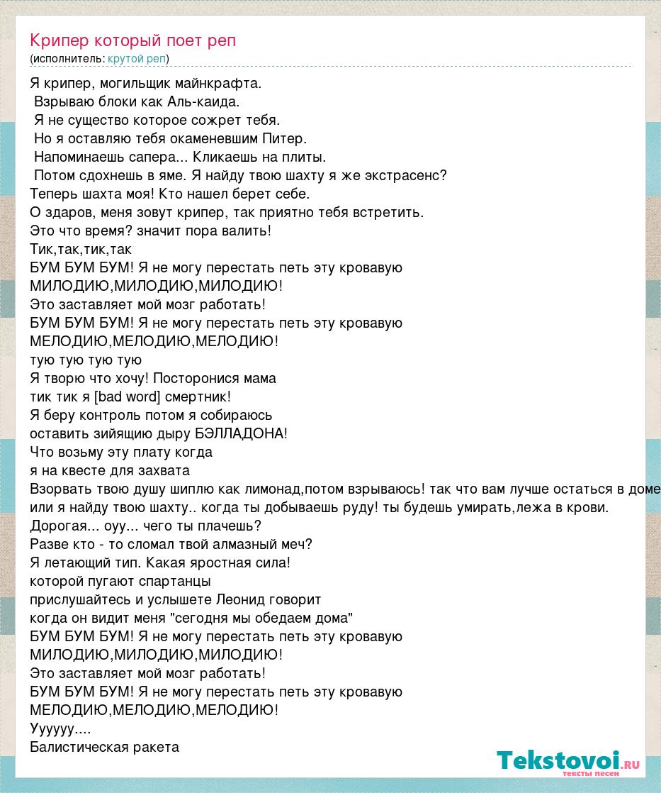 Я крипер, могильщик майнкрафта. Взрываю блоки как Аль-каида. Я не существо которое сожрет тебя. Но я оставляю тебя окаменевшим Питер. Напоминаешь сапера... Кликаешь на плиты. Потом сдохнешь в яме. Я найду твою шахту я же экстрасенс? Теперь шахта моя! Кто нашел берет себе. О здаров, меня зовут крипер, так приятно тебя встретить. Это что время? значит пора валить! Тик,так,тик,так БУМ БУМ БУМ! Я не могу перестать петь эту кровавую МИЛОДИЮ,МИЛОДИЮ,МИЛОДИЮ! Это заставляет мой мозг работать! БУМ БУМ БУМ! Я не могу перестать петь эту кровавую МЕЛОДИЮ,МЕЛОДИЮ,МЕЛОДИЮ! тую тую тую тую Я творю что хочу! Посторонися мама тик тик я [bad word] смертник! Я беру контроль потом я собираюсь оставить зийящию дыру БЭЛЛАДОНА! Что возьму эту плату когда я на квесте для захвата Взорвать твою душу шиплю как лимонад,потом взрываюсь! так что вам лучше остаться в доме или я найду твою шахту.. когда ты добываешь руду! ты будешь умирать,лежа в крови. Дорогая... оуу... чего ты плачешь? Разве кто - то сломал твой алмазный меч? Я летающий тип. Какая яростная сила! которой пугают спартанцы прислушайтесь и услышете Леонид говорит когда он видит меня "сегодня мы обедаем дома" БУМ БУМ БУМ! Я не могу перестать петь эту кровавую МИЛОДИЮ,МИЛОДИЮ,МИЛОДИЮ! Это заставляет мой мозг работать! БУМ БУМ БУМ! Я не могу перестать петь эту кровавую МЕЛОДИЮ,МЕЛОДИЮ,МЕЛОДИЮ! Уууууу.... Балистическая ракета