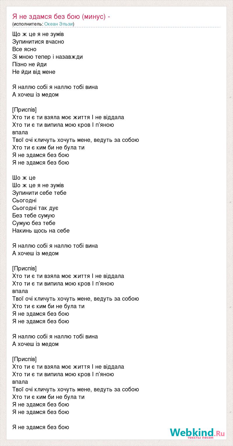 Що ж це я не зумів Зупинитися вчасно Все ясно Зі мною тепер і назавжди Пізно не йди Не йди від мене Я наллю собі я наллю тобі вина А хочеш із медом [Приспів] Хто ти є ти взяла моє життя І не віддала Хто ти є ти випила мою кров І п’яною впала Твої очі кличуть хочуть мене, ведуть за собою Хто ти є ким би не була ти Я не здамся без бою Я не здамся без бою Шо ж це Шо ж це я не зумів Зупинити себе тебе Сьогодні Сьогодні так дує Без тебе сумую Сумую без тебе Накинь щось на себе Я наллю собі я наллю тобі вина А хочеш із медом [Приспів] Хто ти є ти взяла моє життя І не віддала Хто ти є ти випила мою кров І п’яною впала Твої очі кличуть хочуть мене, ведуть за собою Хто ти є ким би не була ти Я не здамся без бою Я не здамся без бою Я наллю собі я наллю тобі вина А хочеш із медом [Приспів] Хто ти є ти взяла моє життя І не віддала Хто ти є ти випила мою кров І п’яною впала Твої очі кличуть хочуть мене, ведуть за собою Хто ти є ким би не була ти Я не здамся без бою Я не здамся без бою Я не здамся без бою