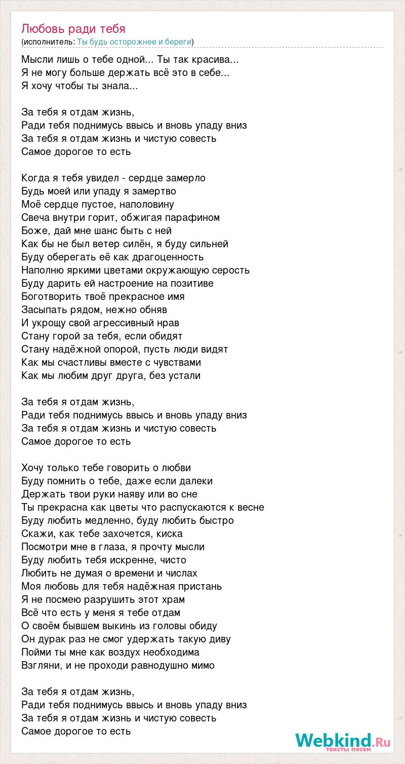 Мысли лишь о тебе одной... Ты так красива... Я не могу больше держать всё это в себе... Я хочу чтобы ты знала... За тебя я отдам жизнь, Ради тебя поднимусь ввысь и вновь упаду вниз За тебя я отдам жизнь и чистую совесть Самое дорогое то есть Когда я тебя увидел - сердце замерло Будь моей или упаду я замертво Моё сердце пустое, наполовину Свеча внутри горит, обжигая парафином Боже, дай мне шанс быть с ней Как бы не был ветер силён, я буду сильней Буду оберегать её как драгоценность Наполню яркими цветами окружающую серость Буду дарить ей настроение на позитиве Боготворить твоё прекрасное имя Засыпать рядом, нежно обняв И укрощу свой агрессивный нрав Стану горой за тебя, если обидят Стану надёжной опорой, пусть люди видят Как мы счастливы вместе с чувствами Как мы любим друг друга, без устали За тебя я отдам жизнь, Ради тебя поднимусь ввысь и вновь упаду вниз За тебя я отдам жизнь и чистую совесть Самое дорогое то есть Хочу только тебе говорить о любви Буду помнить о тебе, даже если далеки Держать твои руки наяву или во сне Ты прекрасна как цветы что распускаются к весне Буду любить медленно, буду любить быстро Скажи, как тебе захочется, киска Посмотри мне в глаза, я прочту мысли Буду любить тебя искренне, чисто Любить не думая о времени и числах Моя любовь для тебя надёжная пристань Я не посмею разрушить этот храм Всё что есть у меня я тебе отдам О своём бывшем выкинь из головы обиду Он дурак раз не смог удержать такую диву Пойми ты мне как воздух необходима Взгляни, и не проходи равнодушно мимо За тебя я отдам жизнь, Ради тебя поднимусь ввысь и вновь упаду вниз За тебя я отдам жизнь и чистую совесть Самое дорогое то есть