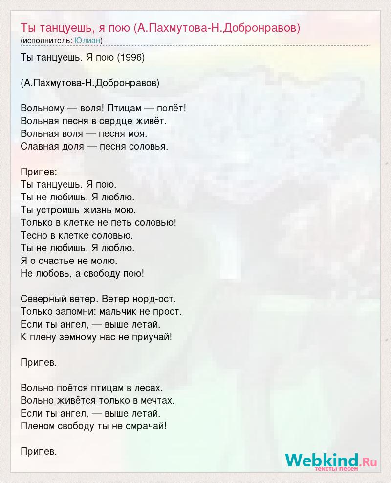 Ты танцуешь. Я пою (1996) (А.Пахмутова-Н.Добронравов) Вольному — воля! Птицам — полёт! Вольная песня в сердце живёт. Вольная воля — песня моя. Славная доля — песня соловья. Припев: Ты танцуешь. Я пою. Ты не любишь. Я люблю. Ты устроишь жизнь мою. Только в клетке не петь соловью! Тесно в клетке соловью. Ты не любишь. Я люблю. Я о счастье не молю. Не любовь, а свободу пою! Северный ветер. Ветер норд-ост. Только запомни: мальчик не прост. Если ты ангел, — выше летай. К плену земному нас не приучай! Припев. Вольно поётся птицам в лесах. Вольно живётся только в мечтах. Если ты ангел, — выше летай. Пленом свободу ты не омрачай! Припев.