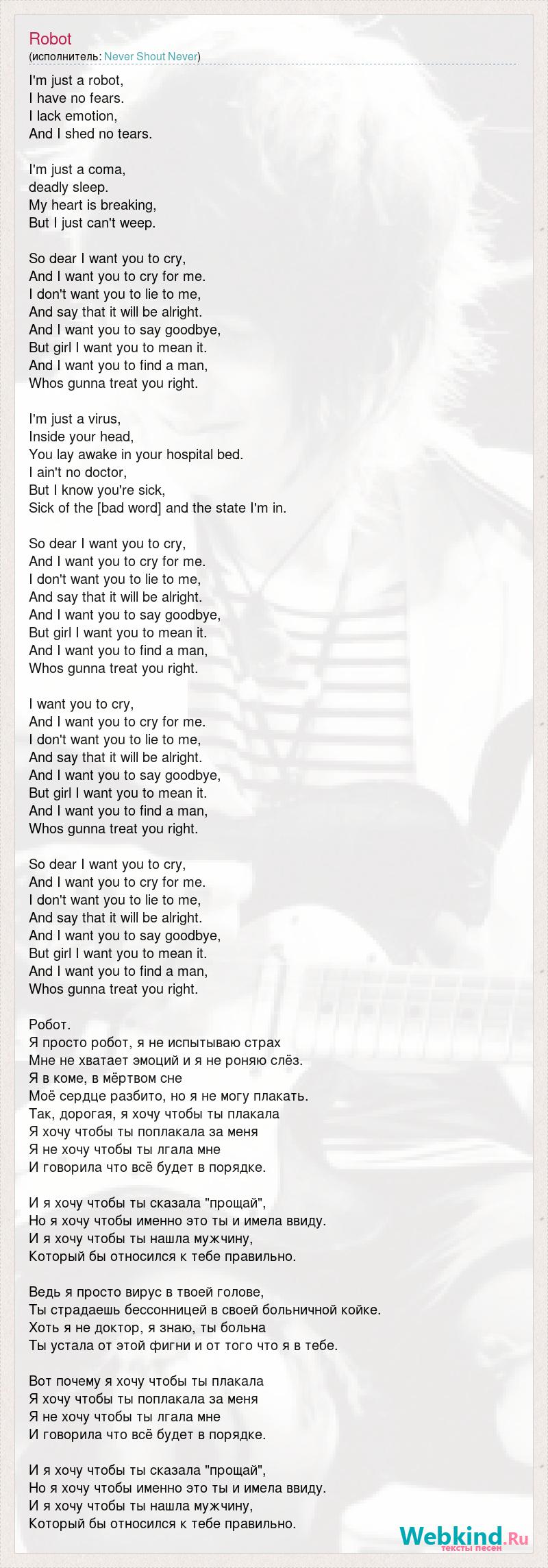I'm just a robot, I have no fears. I lack emotion, And I shed no tears. I'm just a coma, deadly sleep. My heart is breaking, But I just can't weep. So dear I want you to cry, And I want you to cry for me. I don't want you to lie to me, And say that it will be alright. And I want you to say goodbye, But girl I want you to mean it. And I want you to find a man, Whos gunna treat you right. I'm just a virus, Inside your head, You lay awake in your hospital bed. I ain't no doctor, But I know you're sick, Sick of the [bad word] and the state I'm in. So dear I want you to cry, And I want you to cry for me. I don't want you to lie to me, And say that it will be alright. And I want you to say goodbye, But girl I want you to mean it. And I want you to find a man, Whos gunna treat you right. I want you to cry, And I want you to cry for me. I don't want you to lie to me, And say that it will be alright. And I want you to say goodbye, But girl I want you to mean it. And I want you to find a man, Whos gunna treat you right. So dear I want you to cry, And I want you to cry for me. I don't want you to lie to me, And say that it will be alright. And I want you to say goodbye, But girl I want you to mean it. And I want you to find a man, Whos gunna treat you right. Робот. Я просто робот, я не испытываю страх Мне не хватает эмоций и я не роняю слёз. Я в коме, в мёртвом сне Моё сердце разбито, но я не могу плакать. Так, дорогая, я хочу чтобы ты плакала Я хочу чтобы ты поплакала за меня Я не хочу чтобы ты лгала мне И говорила что всё будет в порядке. И я хочу чтобы ты сказала "прощай", Но я хочу чтобы именно это ты и имела ввиду. И я хочу чтобы ты нашла мужчину, Который бы относился к тебе правильно. Ведь я просто вирус в твоей голове, Ты страдаешь бессонницей в своей больничной койке. Хоть я не доктор, я знаю, ты больна Ты устала от этой фигни и от того что я в тебе. Вот почему я хочу чтобы ты плакала Я хочу чтобы ты поплакала за меня Я не хочу чтобы ты лгала мне И говорила что всё будет в порядке. И я хочу чтобы ты сказала "прощай", Но я хочу чтобы именно это ты и имела ввиду. И я хочу чтобы ты нашла мужчину, Который бы относился к тебе правильно.