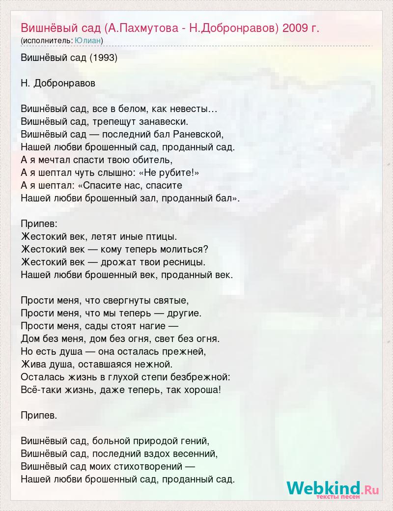 Вишнёвый сад (1993) Н. Добронравов Вишнёвый сад, все в белом, как невесты… Вишнёвый сад, трепещут занавески. Вишнёвый сад — последний бал Раневской, Нашей любви брошенный сад, проданный сад. А я мечтал спасти твою обитель, А я шептал чуть слышно: «Не рубите!» А я шептал: «Спасите нас, спасите Нашей любви брошенный зал, проданный бал». Припев: Жестокий век, летят иные птицы. Жестокий век — кому теперь молиться? Жестокий век — дрожат твои ресницы. Нашей любви брошенный век, проданный век. Прости меня, что свергнуты святые, Прости меня, что мы теперь — другие. Прости меня, сады стоят нагие — Дом без меня, дом без огня, свет без огня. Но есть душа — она осталась прежней, Жива душа, оставшаяся нежной. Осталась жизнь в глухой степи безбрежной: Всё-таки жизнь, даже теперь, так хороша! Припев. Вишнёвый сад, больной природой гений, Вишнёвый сад, последний вздох весенний, Вишнёвый сад моих стихотворений — Нашей любви брошенный сад, проданный сад.