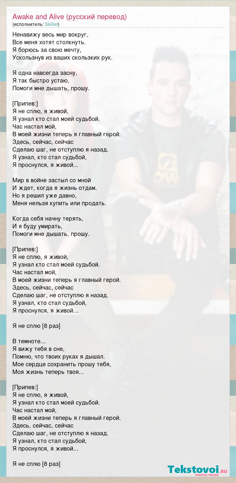 Ненавижу весь мир вокруг, Все меня хотят столкнуть. Я борюсь за свою мечту, Ускользнув из ваших скользких рук. Я одна навсегда засну, Я так быстро устаю, Помоги мне дышать, прошу. [Припев:] Я не сплю, я живой, Я узнал кто стал моей судьбой. Час настал мой, В моей жизни теперь я главный герой. Здесь, сейчас, сейчас Сделаю шаг, не отступлю я назад. Я узнал, кто стал судьбой, Я проснулся, я живой... Мир в войне застыл со мной И ждет, когда я жизнь отдам. Но я решил уже давно, Меня нельзя купить или продать. Когда себя начну терять, И я буду умирать, Помоги мне дышать, прошу. [Припев:] Я не сплю, я живой, Я узнал кто стал моей судьбой. Час настал мой, В моей жизни теперь я главный герой. Здесь, сейчас, сейчас Сделаю шаг, не отступлю я назад. Я узнал, кто стал судьбой, Я проснулся, я живой... Я не сплю [8 раз] В темноте... Я вижу тебя в сне, Помню, что твоих руках я дышал. Мое сердце сохранить прошу тебя, Моя жизнь теперь твоя... [Припев:] Я не сплю, я живой, Я узнал кто стал моей судьбой. Час настал мой, В моей жизни теперь я главный герой. Здесь, сейчас, сейчас Сделаю шаг, не отступлю я назад. Я узнал, кто стал судьбой, Я проснулся, я живой... Я не сплю [8 раз]