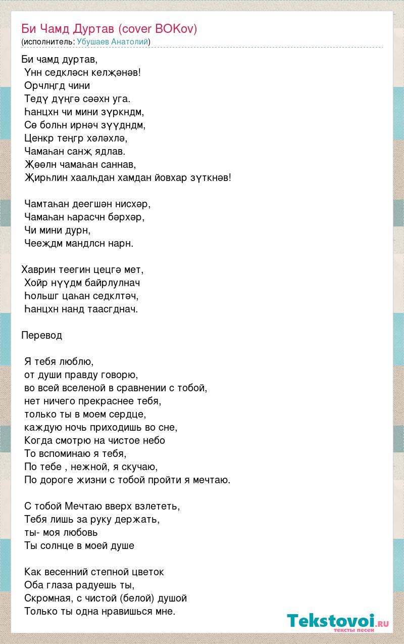 Би чамд дуртав, Үнн седкләсн келҗәнәв! Орчлңгд чини Тедү дүңгә сәәхн уга. Һанцхн чи мини зүркндм, Сө болһн ирнәч зүүдндм, Ценкр теңгр хәләхлә, Чамаһан санҗ ядлав. Җөөлн чамаһан саннав, Җирһлин хаалһдан хамдан йовхар зүткнәв! Чамтаһан деегшән нисхәр, Чамаһан һарасчн бәрхәр, Чи мини дурн, Чееҗдм мандлсн нарн. Хаврин теегин цецгә мет, Хойр нүүдм байрлулнач Һольшг цаһан седклтәч, Һанцхн нанд таасгднач. Перевод Я тебя люблю, от души правду говорю, во всей вселеной в сравнении с тобой, нет ничего прекраснее тебя, только ты в моем сердце, каждую ночь приходишь во сне, Когда смотрю на чистое небо То вспоминаю я тебя, По тебе , нежной, я скучаю, По дороге жизни с тобой пройти я мечтаю. С тобой Мечтаю вверх взлететь, Тебя лишь за руку держать, ты- моя любовь Ты солнце в моей душе Как весенний степной цветок Оба глаза радуешь ты, Скромная, с чистой (белой) душой Только ты одна нравишься мне.