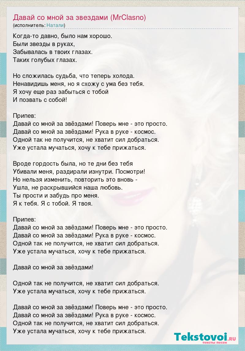 Когда-то давно, было нам хорошо. Были звезды в руках, Забывалась в твоих глазах. Таких голубых глазах. Но сложилась судьба, что теперь холода. Ненавидишь меня, но я схожу с ума без тебя. Я хочу еще раз забыться с тобой И позвать с собой! Припев: Давай со мной за звёздами! Поверь мне - это просто. Давай со мной за звёздами! Рука в руке - космос. Одной так не получится, не хватит сил добраться. Уже устала мучаться, хочу к тебе прижаться. Вроде гордость была, но те дни без тебя Убивали меня, раздирали изнутри. Посмотри! Но нельзя изменить, повторить это вновь - Ушла, не раскрывшийся наша любовь. Ты прости и забудь про меня. Я к тебя. Я с тобой. Я твоя. Припев: Давай со мной за звёздами! Поверь мне - это просто. Давай со мной за звёздами! Рука в руке - космос. Одной так не получится, не хватит сил добраться. Уже устала мучаться, хочу к тебе прижаться. Давай со мной за звёздами! Одной так не получится, не хватит сил добраться. Уже устала мучаться, хочу к тебе прижаться. Давай со мной за звёздами! Поверь мне - это просто. Давай со мной за звёздами! Рука в руке - космос. Одной так не получится, не хватит сил добраться. Уже устала мучаться, хочу к тебе прижаться.
