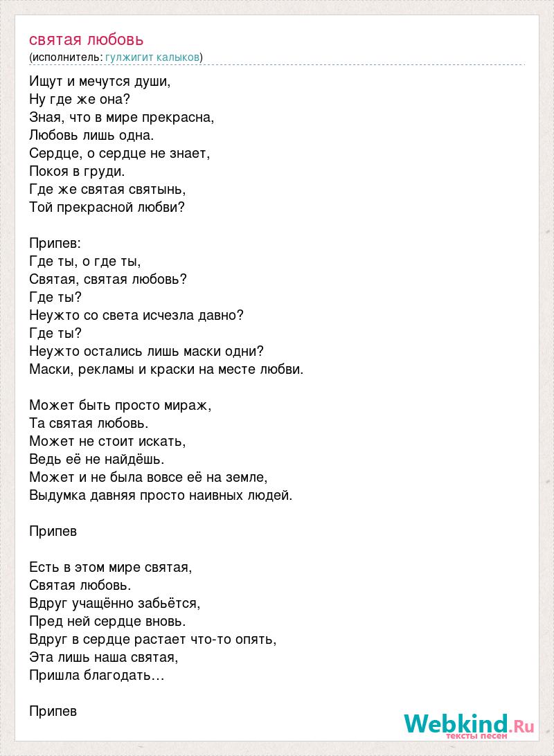 Ищут и мечутся души, Ну где же она? Зная, что в мире прекрасна, Любовь лишь одна. Сердце, о сердце не знает, Покоя в груди. Где же святая святынь, Той прекрасной любви? Припев: Где ты, о где ты, Святая, святая любовь? Где ты? Неужто со света исчезла давно? Где ты? Неужто остались лишь маски одни? Маски, рекламы и краски на месте любви. Может быть просто мираж, Та святая любовь. Может не стоит искать, Ведь её не найдёшь. Может и не была вовсе её на земле, Выдумка давняя просто наивных людей. Припев Есть в этом мире святая, Святая любовь. Вдруг учащённо забьётся, Пред ней сердце вновь. Вдруг в сердце растает что-то опять, Эта лишь наша святая, Пришла благодать… Припев