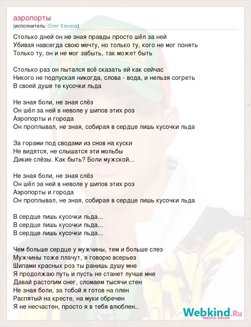 Столько дней он не зная правды просто шёл за ней Убивая навсегда свою мечту, но только ту, кого не мог понять Только ту, он и не мог забыть, так может быть Столько раз он пытался всё сказать ей как сейчас Никого не подпуская никогда, слова - вода, и нельзя согреть В своей душе те кусочки льда Не зная боли, не зная слёз Он шёл за ней в неволе у шипов этих роз Аэропорты и города Он проплывал, не зная, собирая в сердце лишь кусочки льда За горами под сводами из снов на куски Не видятся, не слышатся эти мольбы Дикие слёзы. Как быть? Боли мужской... Не зная боли, не зная слёз Он шёл за ней в неволе у шипов этих роз Аэропорты и города Он проплывал, не зная, собирая в сердце лишь кусочки льда В сердце лишь кусочки льда... В сердце лишь кусочки льда... В сердце лишь кусочки льда... Чем больше сердце у мужчины, тем и больше слез Мужчины тоже плачут, я говорю всерьез Шипами красных роз ты ранишь душу мне Я продолжаю путь и пусть не станет лучше мне Давай растопим снег, сломаем тысячи стен Не зная боли, за тобой я готов на плен Распятый на кресте, на муки обречен Я не несчастен, просто я в тебя влюблен..