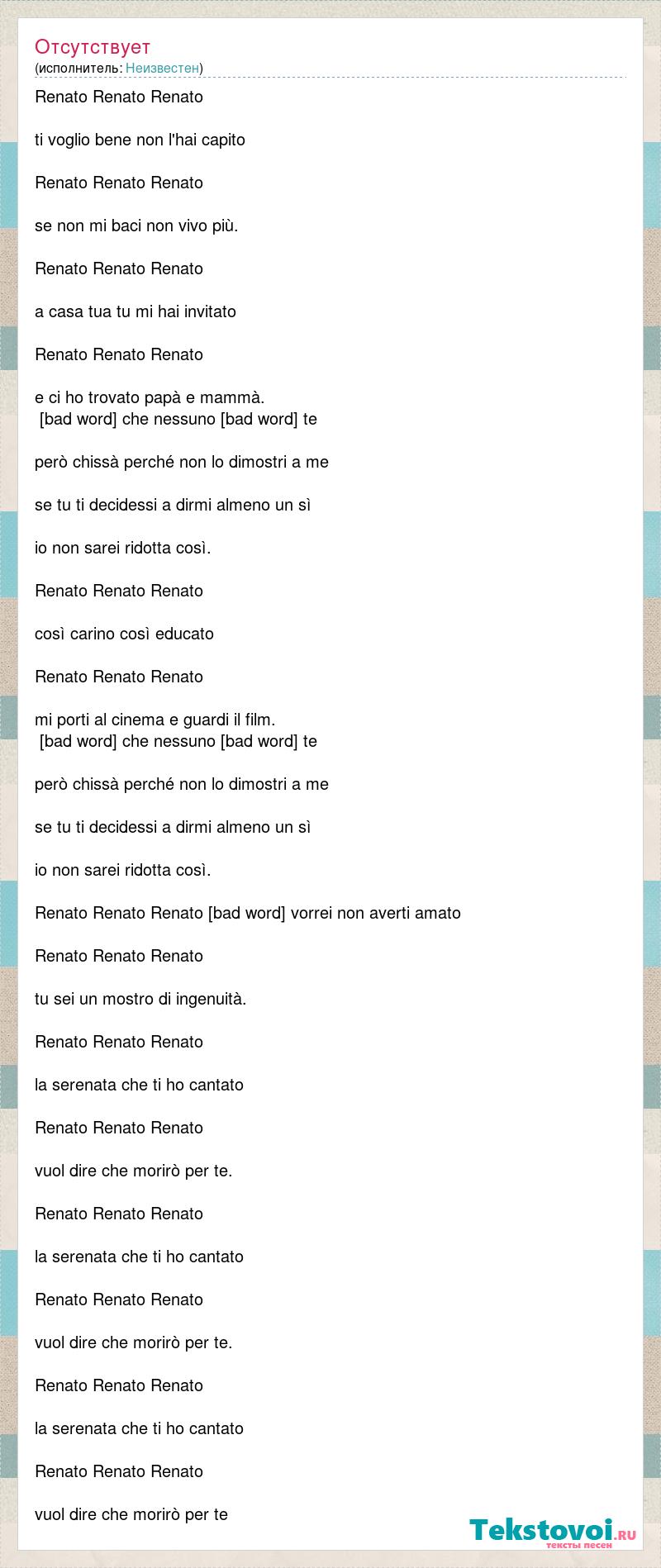 Renato Renato Renato ti voglio bene non l'hai capito Renato Renato Renato se non mi baci non vivo più. Renato Renato Renato a casa tua tu mi hai invitato Renato Renato Renato e ci ho trovato papà e mammà. Scommetto che nessuno bacia come te però chissà perché non lo dimostri a me se tu ti decidessi a dirmi almeno un sì io non sarei ridotta così. Renato Renato Renato così carino così educato Renato Renato Renato mi porti al cinema e guardi il film. Scommetto che nessuno bacia come te però chissà perché non lo dimostri a me se tu ti decidessi a dirmi almeno un sì io non sarei ridotta così. Renato Renato Renato come vorrei non averti amato Renato Renato Renato tu sei un mostro di ingenuità. Renato Renato Renato la serenata che ti ho cantato Renato Renato Renato vuol dire che morirò per te. Renato Renato Renato la serenata che ti ho cantato Renato Renato Renato vuol dire che morirò per te. Renato Renato Renato la serenata che ti ho cantato Renato Renato Renato vuol dire che morirò per te