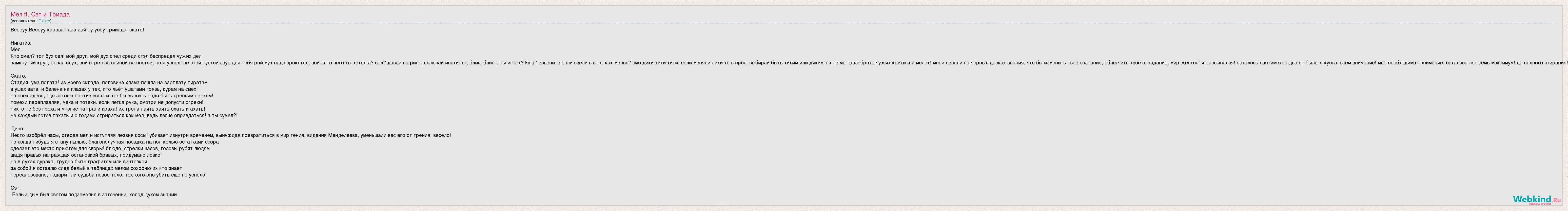 Веееуу Веееуу караван ааа аай оу уооу трииада, скато! Нигатив: Мел. Кто смел? тот бух сел! мой друг, мой дух спел среди стэл беспредел чужих дел замкнутый круг, резал слух, вой стрел за спиной на постой, но я успел! не стой пустой звук для тебя рой мух над горою тел, война то чего ты хотел а? сел? давай на ринг, включай инстинкт, блик, блинг, ты игрок? king? извените если ввели в шок, как мелок? эмо дики тики тики, если меняли лики то в прок, выбирай быть тихим или диким ты не мог разобрать чужих крики а я мелок! мной писали на чёрных досках знания, что бы изменить твоё сознание, облегчить твоё страдание, мир жесток! я рассыпался! осталось сантиметра два от былого куска, всем внимание! мне необходимо понимание, осталось лет семь максимум! до полного стирания! Скато: Стадия! ума полата! из моего склада, половина хлама пошла на зарплату пиратам в ушах вата, и белена на глазах у тех, кто льёт ушатами грязь, курам на смех! на спех здесь, где законы против всех! и что бы выжить надо быть крепким орехом! помехи переплавляя, меха и потехи. если легка рука, смотри не допусти огрехи! никто не без греха и многие на грани краха! их тропа лаять хаять охать и ахать! не каждый готов пахать и с годами стрираться как мел, ведь легче оправдаться! а ты сумел?! Дино: Некто изобрёл часы, стерая мел и иступляя лезвия косы! убивает изнутри временем, вынуждая превратиться в мир гения, видения Менделеева, уменьшали вес его от трения, весело! но когда нибудь я стану пылью, благополучная посадка на пол келью остатками ссора сделает это место приютом для своры! блюдо, стрелки часов, головы рубят людям щадя правых награждая остановкой бравых, придумано ловко! но в руках дурака, трудно быть графитом или винтовкой за собой я оставлю след белый в таблицах мелом сохроню их кто знает нереалезовано, подарит ли судьба новое тело, тех кого оно убить ещё не успело! Сэт: Белый дым был светом подземелья в заточеньи, холод духом знаний