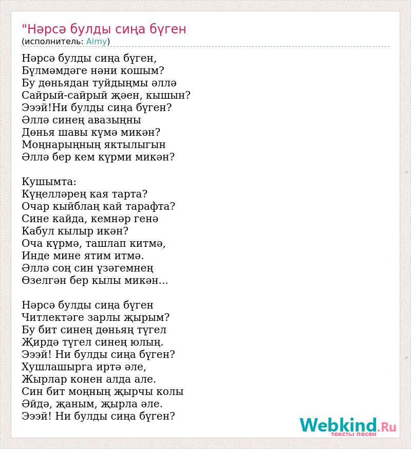 Нәрсә булды сиңа бүген, Бүлмәмдәге нәни кошым? Бу дөньядан туйдыңмы әллә Сайрый-сайрый җәен, кышын? Эээй!Ни булды сиңа бүген? Әллә синең авазыңны Дөнья шавы күмә микән? Моңнарыңның яктылыгын Әллә бер кем күрми микән? Кушымта: Күңелләрең кая тарта? Очар кыйблаң кай тарафта? Сине кайда, кемнәр генә Кабул кылыр икән? Оча күрмә, ташлап китмә, Инде мине ятим итмә. Әллә соң син үзәгемнең Өзелгән бер кылы микән... Нәрсә булды сиңа бүген Читлектәге зарлы җырым? Бу бит синең дөньяң түгел Җирдә түгел синең юлың. Эээй! Ни булды сиңа бүген? Хушлашырга иртә әле, Жырлар конен алда але. Син бит моңның җырчы колы Әйдә, җаным, җырла әле. Эээй! Ни булды сиңа бүген?