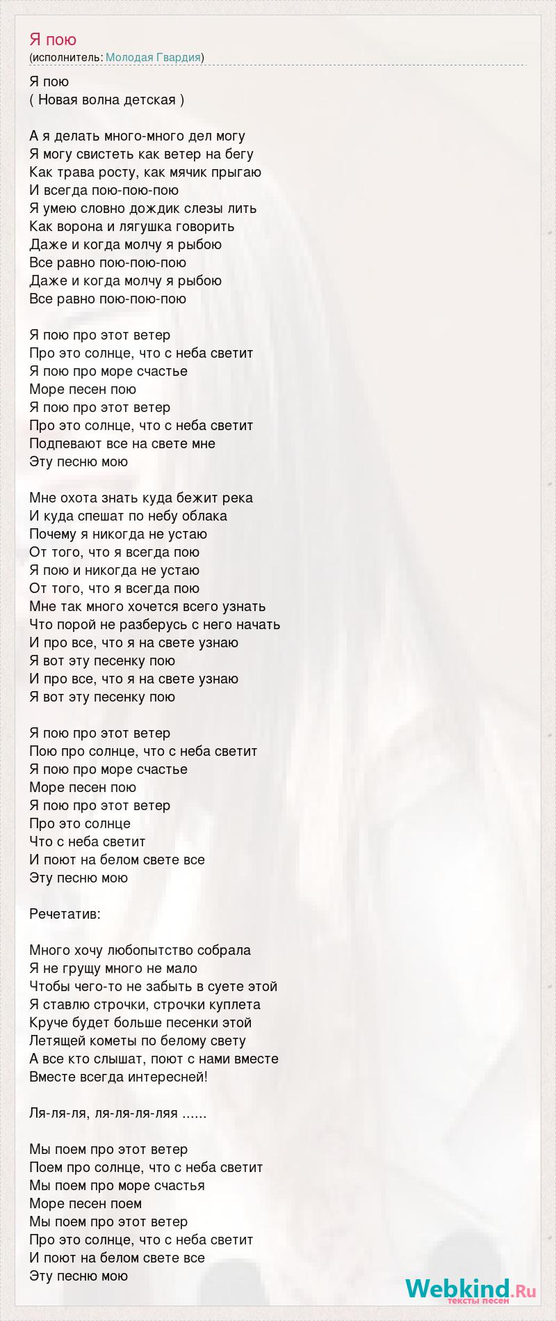 Я пою ( Новая волна детская ) А я делать много-много дел могу Я могу свистеть как ветер на бегу Как трава росту, как мячик прыгаю И всегда пою-пою-пою Я умею словно дождик слезы лить Как ворона и лягушка говорить Даже и когда молчу я рыбою Все равно пою-пою-пою Даже и когда молчу я рыбою Все равно пою-пою-пою Я пою про этот ветер Про это солнце, что с неба светит Я пою про море счастье Море песен пою Я пою про этот ветер Про это солнце, что с неба светит Подпевают все на свете мне Эту песню мою Мне охота знать куда бежит река И куда спешат по небу облака Почему я никогда не устаю От того, что я всегда пою Я пою и никогда не устаю От того, что я всегда пою Мне так много хочется всего узнать Что порой не разберусь с него начать И про все, что я на свете узнаю Я вот эту песенку пою И про все, что я на свете узнаю Я вот эту песенку пою Я пою про этот ветер Пою про солнце, что с неба светит Я пою про море счастье Море песен пою Я пою про этот ветер Про это солнце Что с неба светит И поют на белом свете все Эту песню мою Речетатив: Много хочу любопытство собрала Я не грущу много не мало Чтобы чего-то не забыть в суете этой Я ставлю строчки, строчки куплета Круче будет больше песенки этой Летящей кометы по белому свету А все кто слышат, поют с нами вместе Вместе всегда интересней! Ля-ля-ля, ля-ля-ля-ляя ...... Мы поем про этот ветер Поем про солнце, что с неба светит Мы поем про море счастья Море песен поем Мы поем про этот ветер Про это солнце, что с неба светит И поют на белом свете все Эту песню мою