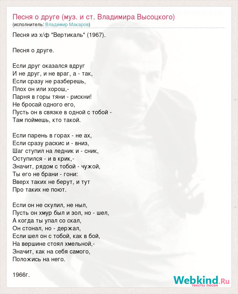 Песня из х/ф "Вертикаль" (1967). Песня о друге. Если друг оказался вдруг И не друг, и не враг, а - так, Если сразу не разберешь, Плох он или хорош,- Парня в горы тяни - рискни! Не бросай одного его, Пусть он в связке в одной с тобой - Там поймешь, кто такой. Если парень в горах - не ах, Если сразу раскис и - вниз, Шаг ступил на ледник и - сник, Оступился - и в крик,- Значит, рядом с тобой - чужой, Ты его не брани - гони: Вверх таких не берут, и тут Про таких не поют. Если он не скулил, не ныл, Пусть он хмур был и зол, но - шел, А когда ты упал со скал, Он стонал, но - держал, Если шел он с тобой, как в бой, На вершине стоял хмельной,- Значит, как на себя самого, Положись на него. 1966г.
