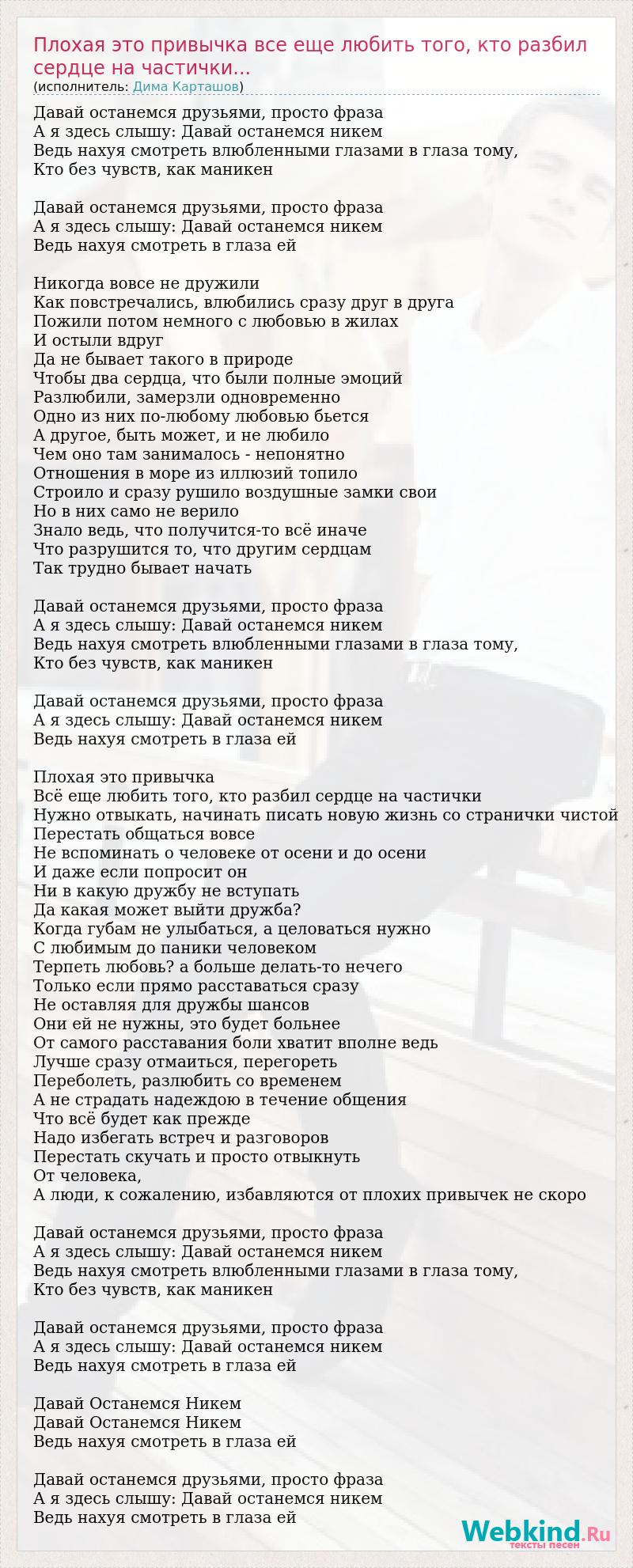 Главная→Исполнители→Дима Карташов→Плохая это привычка все еще любить того, кто разбил сердце на частички...