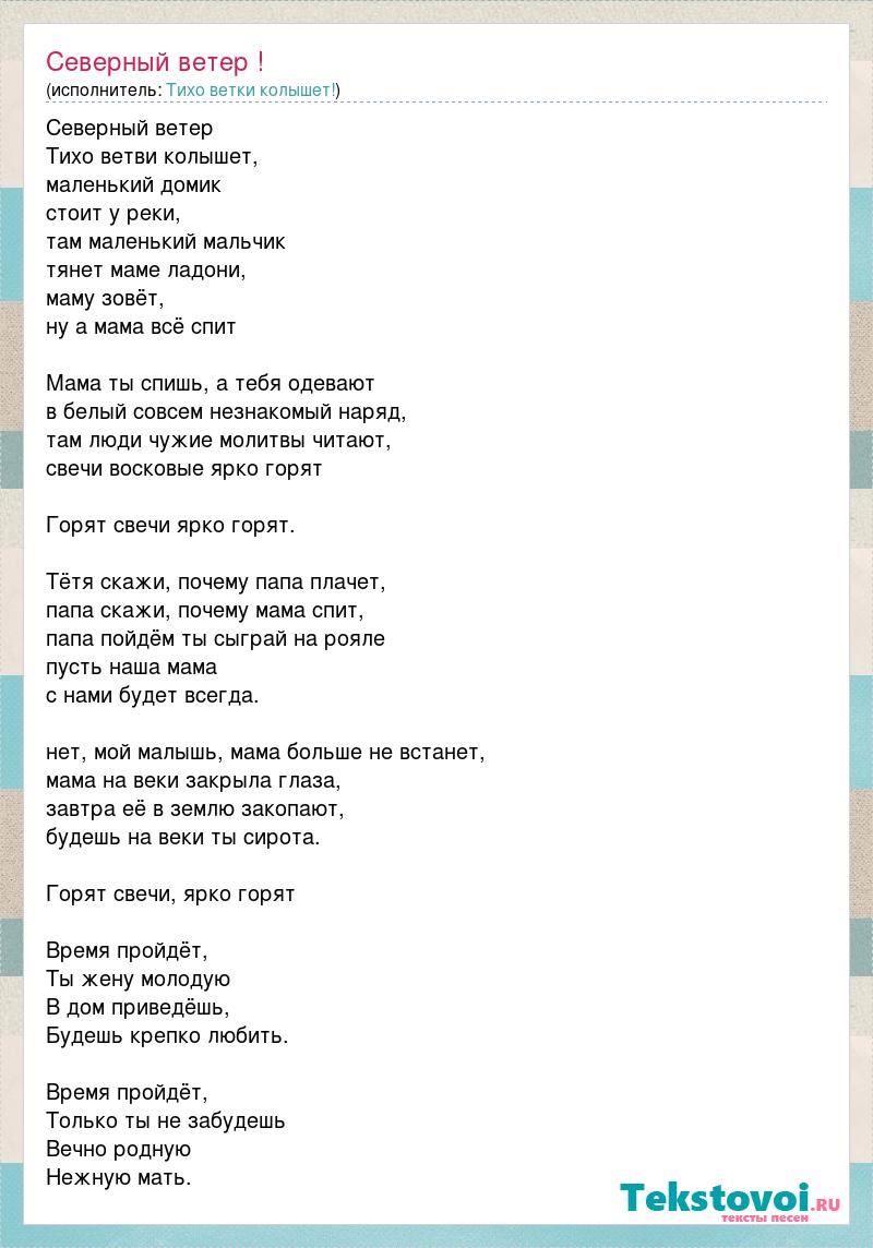 Северный ветер Тихо ветви колышет, маленький домик стоит у реки, там маленький мальчик тянет маме ладони, маму зовёт, ну а мама всё спит Мама ты спишь, а тебя одевают в белый совсем незнакомый наряд, там люди чужие молитвы читают, свечи восковые ярко горят Горят свечи ярко горят. Тётя скажи, почему папа плачет, папа скажи, почему мама спит, папа пойдём ты сыграй на рояле пусть наша мама с нами будет всегда. нет, мой малышь, мама больше не встанет, мама на веки закрыла глаза, завтра её в землю закопают, будешь на веки ты сирота. Горят свечи, ярко горят Время пройдёт, Ты жену молодую В дом приведёшь, Будешь крепко любить. Время пройдёт, Только ты не забудешь Вечно родную Нежную мать.