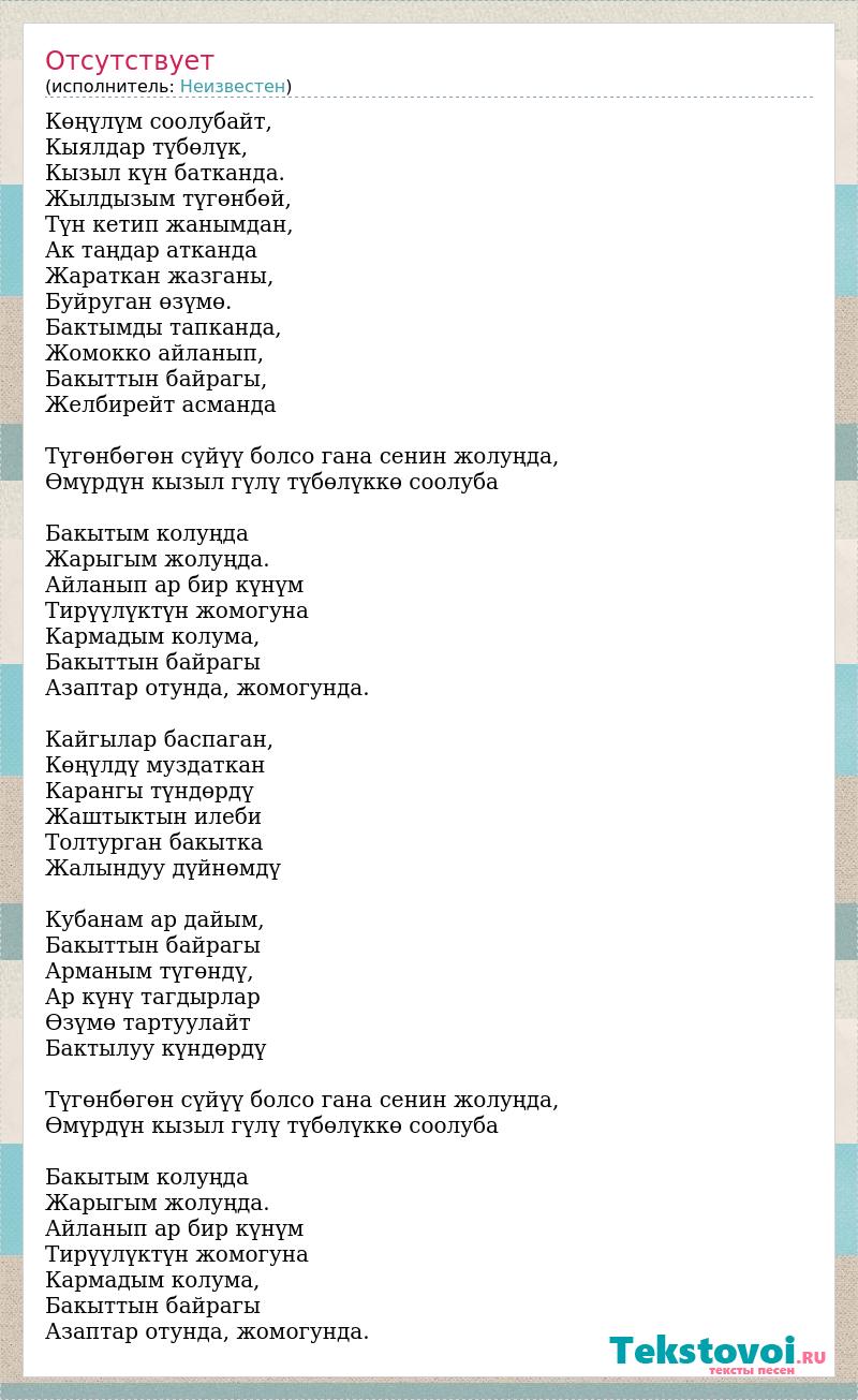 Көңүлүм соолубайт, Кыялдар түбөлүк, Кызыл күн батканда. Жылдызым түгөнбөй, Түн кетип жанымдан, Ак таңдар атканда Жараткан жазганы, Буйруган өзүмө. Бактымды тапканда, Жомокко айланып, Бакыттын байрагы, Желбирейт асманда Түгөнбөгөн сүйүү болсо гана сенин жолуңда, Өмүрдүн кызыл гүлү түбөлүккө соолуба Бакытым колуңда Жарыгым жолуңда. Айланып ар бир күнүм Тирүүлүктүн жомогуна Кармадым колума, Бакыттын байрагы Азаптар отунда, жомогунда. Кайгылар баспаган, Көңүлдү муздаткан Карангы түндөрдү Жаштыктын илеби Толтурган бакытка Жалындуу дүйнөмдү Кубанам ар дайым, Бакыттын байрагы Арманым түгөндү, Ар күнү тагдырлар Өзүмө тартуулайт Бактылуу күндөрдү Түгөнбөгөн сүйүү болсо гана сенин жолуңда, Өмүрдүн кызыл гүлү түбөлүккө соолуба Бакытым колуңда Жарыгым жолуңда. Айланып ар бир күнүм Тирүүлүктүн жомогуна Кармадым колума, Бакыттын байрагы Азаптар отунда, жомогунда.