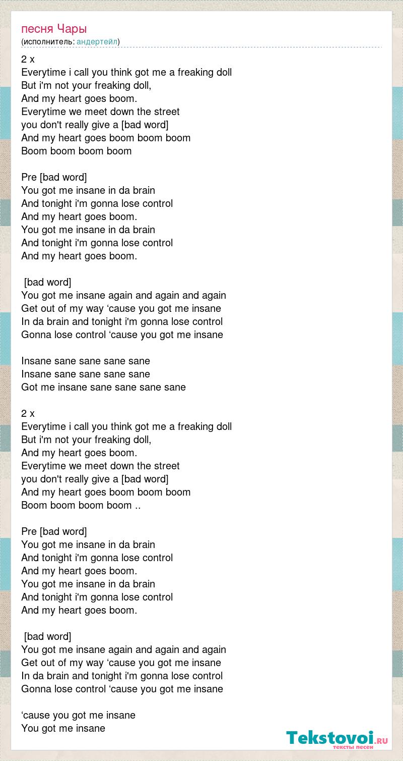 2 x Everytime i call you think got me a freaking doll But i'm not your freaking doll, And my heart goes boom. Everytime we meet down the street you don't really give a [bad word] And my heart goes boom boom boom Boom boom boom boom Pre [bad word] You got me insane in da brain And tonight i'm gonna lose control And my heart goes boom. You got me insane in da brain And tonight i'm gonna lose control And my heart goes boom. [bad word] You got me insane again and again and again Get out of my way ‘cause you got me insane In da brain and tonight i'm gonna lose control Gonna lose control ‘cause you got me insane Insane sane sane sane sane Insane sane sane sane sane Got me insane sane sane sane sane 2 x Everytime i call you think got me a freaking doll But i'm not your freaking doll, And my heart goes boom. Everytime we meet down the street you don't really give a [bad word] And my heart goes boom boom boom Boom boom boom boom .. Pre [bad word] You got me insane in da brain And tonight i'm gonna lose control And my heart goes boom. You got me insane in da brain And tonight i'm gonna lose control And my heart goes boom. [bad word] You got me insane again and again and again Get out of my way ‘cause you got me insane In da brain and tonight i'm gonna lose control Gonna lose control ‘cause you got me insane ‘cause you got me insane You got me insane