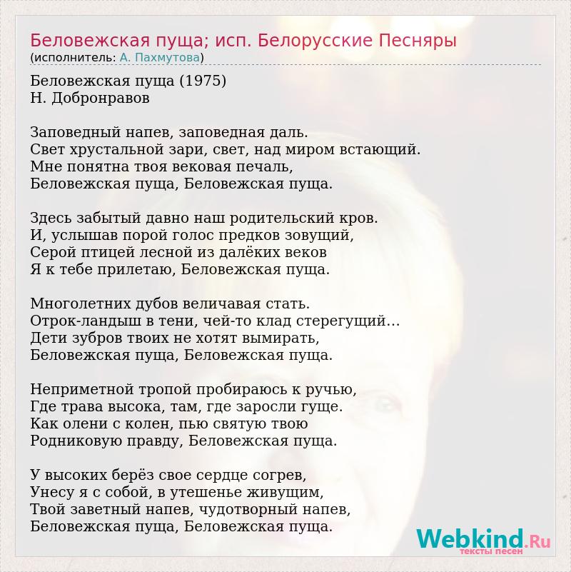 Беловежская пуща (1975) Н. Добронравов Заповедный напев, заповедная даль. Свет хрустальной зари, свет, над миром встающий. Мне понятна твоя вековая печаль, Беловежская пуща, Беловежская пуща. Здесь забытый давно наш родительский кров. И, услышав порой голос предков зовущий, Серой птицей лесной из далёких веков Я к тебе прилетаю, Беловежская пуща. Многолетних дубов величавая стать. Отрок-ландыш в тени, чей-то клад стерегущий… Дети зубров твоих не хотят вымирать, Беловежская пуща, Беловежская пуща. Неприметной тропой пробираюсь к ручью, Где трава высока, там, где заросли гуще. Как олени с колен, пью святую твою Родниковую правду, Беловежская пуща. У высоких берёз свое сердце согрев, Унесу я с собой, в утешенье живущим, Твой заветный напев, чудотворный напев, Беловежская пуща, Беловежская пуща.