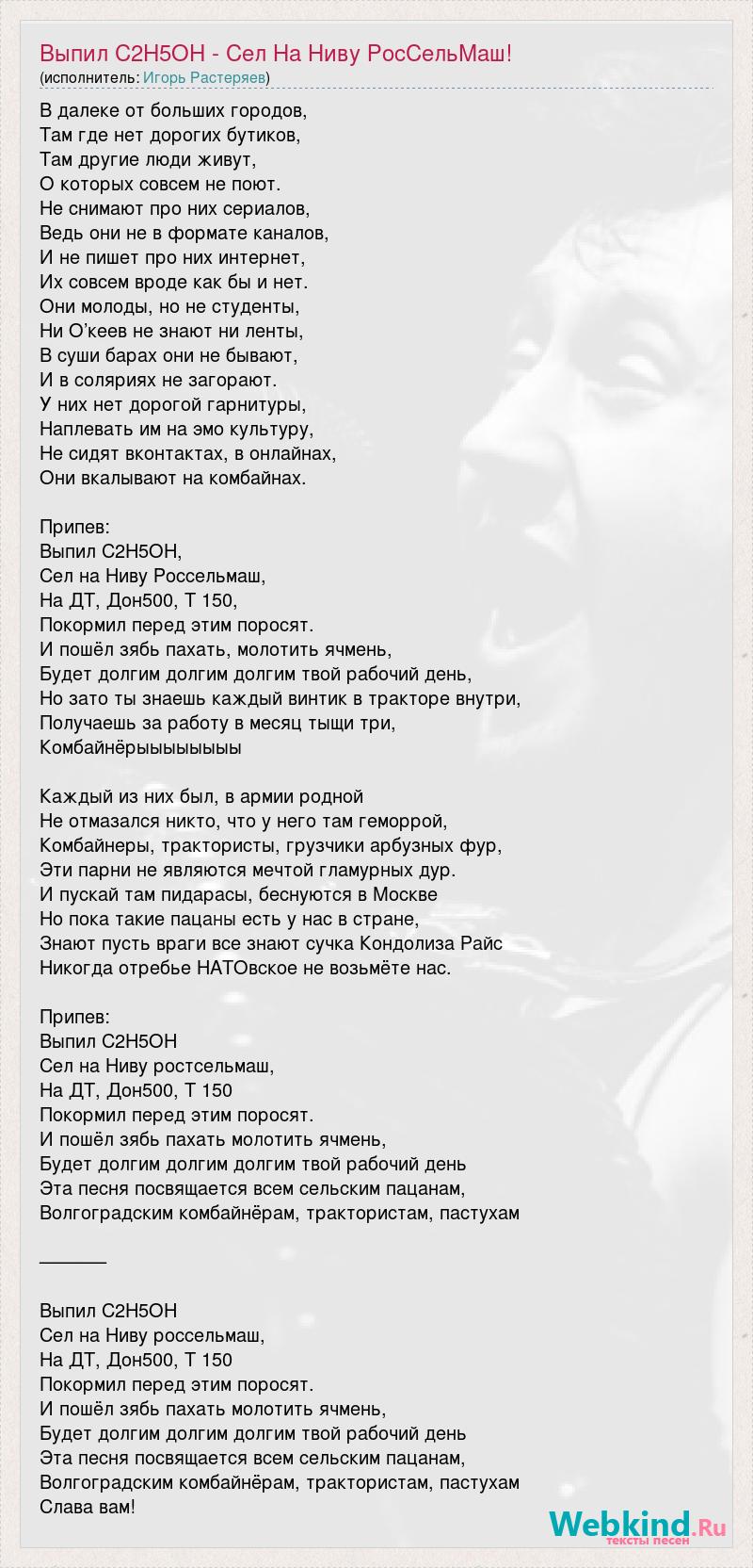 В далеке от больших городов, Там где нет дорогих бутиков, Там другие люди живут, О которых совсем не поют. Не снимают про них сериалов, Ведь они не в формате каналов, И не пишет про них интернет, Их совсем вроде как бы и нет. Они молоды, но не студенты, Ни О’кеев не знают ни ленты, В суши барах они не бывают, И в соляриях не загорают. У них нет дорогой гарнитуры, Наплевать им на эмо культуру, Не сидят вконтактах, в онлайнах, Они вкалывают на комбайнах. Припев: Выпил С2H5OH, Сел на Ниву Россельмаш, На ДТ, Дон500, Т 150, Покормил перед этим поросят. И пошёл зябь пахать, молотить ячмень, Будет долгим долгим долгим твой рабочий день, Но зато ты знаешь каждый винтик в тракторе внутри, Получаешь за работу в месяц тыщи три, Комбайнёрыыыыыыыы Каждый из них был, в армии родной Не отмазался никто, что у него там геморрой, Комбайнеры, трактористы, грузчики арбузных фур, Эти парни не являются мечтой гламурных дур. И пускай там пидарасы, беснуются в Москве Но пока такие пацаны есть у нас в стране, Знают пусть враги все знают сучка Кондолиза Райс Никогда отребье НАТОвское не возьмёте нас. Припев: Выпил С2H5OH Сел на Ниву ростсельмаш, На ДТ, Дон500, Т 150 Покормил перед этим поросят. И пошёл зябь пахать молотить ячмень, Будет долгим долгим долгим твой рабочий день Эта песня посвящается всем сельским пацанам, Волгоградским комбайнёрам, трактористам, пастухам ———– Выпил С2H5OH Сел на Ниву россельмаш, На ДТ, Дон500, Т 150 Покормил перед этим поросят. И пошёл зябь пахать молотить ячмень, Будет долгим долгим долгим твой рабочий день Эта песня посвящается всем сельским пацанам, Волгоградским комбайнёрам, трактористам, пастухам Слава вам!