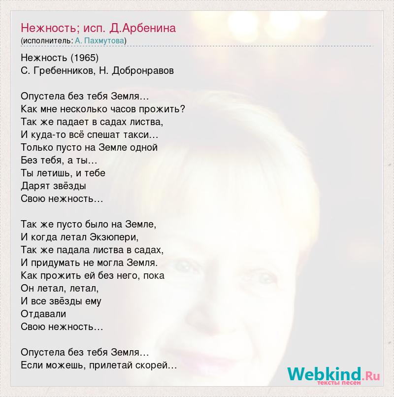 Нежность (1965) С. Гребенников, Н. Добронравов Опустела без тебя Земля… Как мне несколько часов прожить? Так же падает в садах листва, И куда-то всё спешат такси… Только пусто на Земле одной Без тебя, а ты… Ты летишь, и тебе Дарят звёзды Свою нежность… Так же пусто было на Земле, И когда летал Экзюпери, Так же падала листва в садах, И придумать не могла Земля. Как прожить ей без него, пока Он летал, летал, И все звёзды ему Отдавали Свою нежность… Опустела без тебя Земля… Если можешь, прилетай скорей…