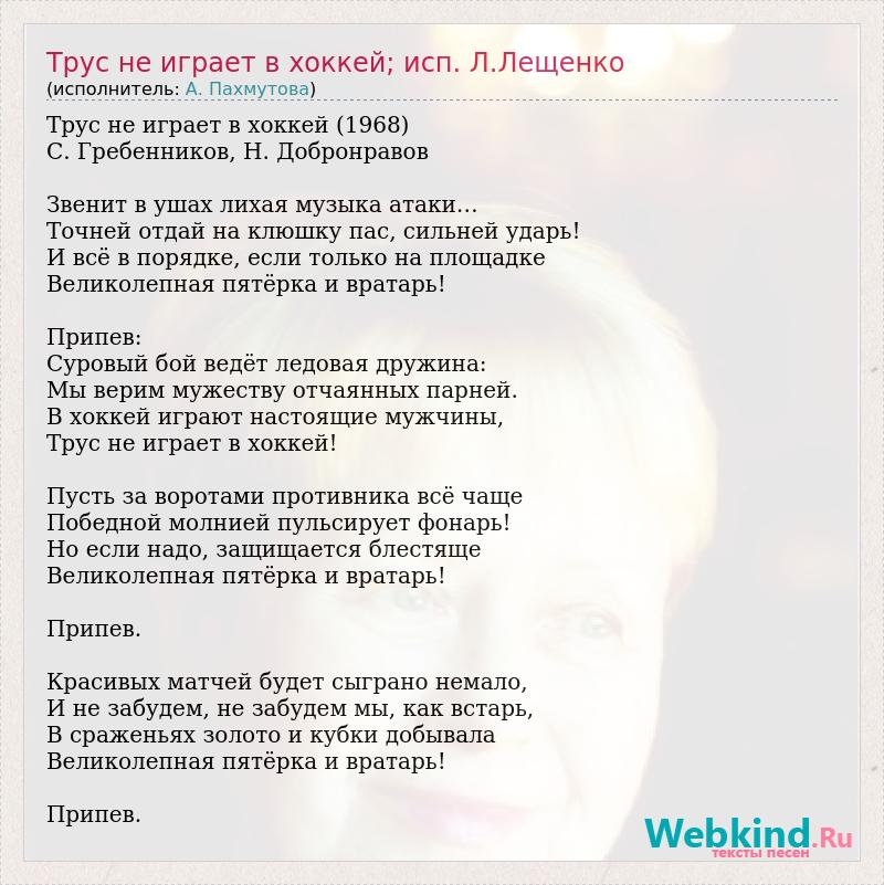 Трус не играет в хоккей (1968) С. Гребенников, Н. Добронравов Звенит в ушах лихая музыка атаки… Точней отдай на клюшку пас, сильней ударь! И всё в порядке, если только на площадке Великолепная пятёрка и вратарь! Припев: Суровый бой ведёт ледовая дружина: Мы верим мужеству отчаянных парней. В хоккей играют настоящие мужчины, Трус не играет в хоккей! Пусть за воротами противника всё чаще Победной молнией пульсирует фонарь! Но если надо, защищается блестяще Великолепная пятёрка и вратарь! Припев. Красивых матчей будет сыграно немало, И не забудем, не забудем мы, как встарь, В сраженьях золото и кубки добывала Великолепная пятёрка и вратарь! Припев.