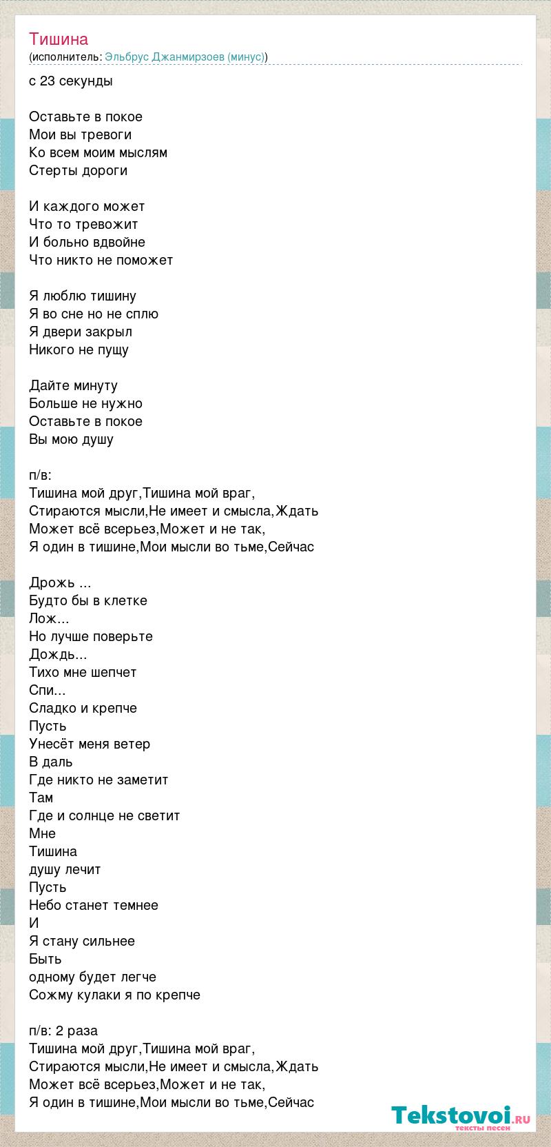 с 23 секунды Оставьте в покое Мои вы тревоги Ко всем моим мыслям Стерты дороги И каждого может Что то тревожит И больно вдвойне Что никто не поможет Я люблю тишину Я во сне но не сплю Я двери закрыл Никого не пущу Дайте минуту Больше не нужно Оставьте в покое Вы мою душу п/в: Тишина мой друг,Тишина мой враг, Стираются мысли,Не имеет и смысла,Ждать Может всё всерьез,Может и не так, Я один в тишине,Мои мысли во тьме,Сейчас Дрожь ... Будто бы в клетке Лож... Но лучше поверьте Дождь... Тихо мне шепчет Спи... Сладко и крепче Пусть Унесёт меня ветер В даль Где никто не заметит Там Где и солнце не светит Мне Тишина душу лечит Пусть Небо станет темнее И Я стану сильнее Быть одному будет легче Сожму кулаки я по крепче п/в: 2 раза Тишина мой друг,Тишина мой враг, Стираются мысли,Не имеет и смысла,Ждать Может всё всерьез,Может и не так, Я один в тишине,Мои мысли во тьме,Сейчас