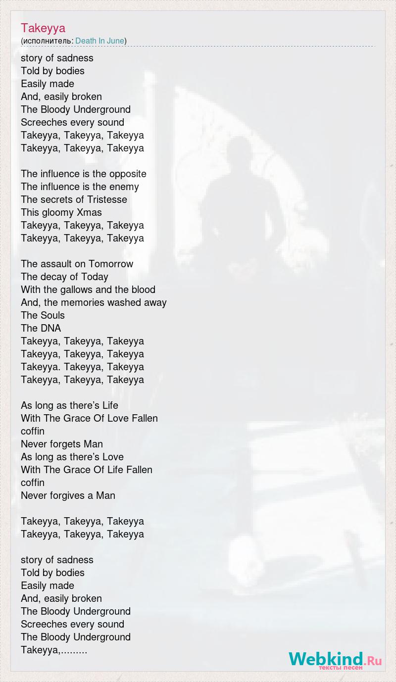 story of sadness Told by bodies Easily made And, easily broken The Bloody Underground Screeches every sound Takeyya, Takeyya, Takeyya Takeyya, Takeyya, Takeyya The influence is the opposite The influence is the enemy The secrets of Tristesse This gloomy Xmas Takeyya, Takeyya, Takeyya Takeyya, Takeyya, Takeyya The assault on Tomorrow The decay of Today With the gallows and the blood And, the memories washed away The Souls The DNA Takeyya, Takeyya, Takeyya Takeyya, Takeyya, Takeyya Takeyya. Takeyya, Takeyya Takeyya, Takeyya, Takeyya As long as there’s Life With The Grace Of Love Fallen coffin Never forgets Man As long as there’s Love With The Grace Of Life Fallen coffin Never forgives a Man Takeyya, Takeyya, Takeyya Takeyya, Takeyya, Takeyya story of sadness Told by bodies Easily made And, easily broken The Bloody Underground Screeches every sound The Bloody Underground Takeyya,.........