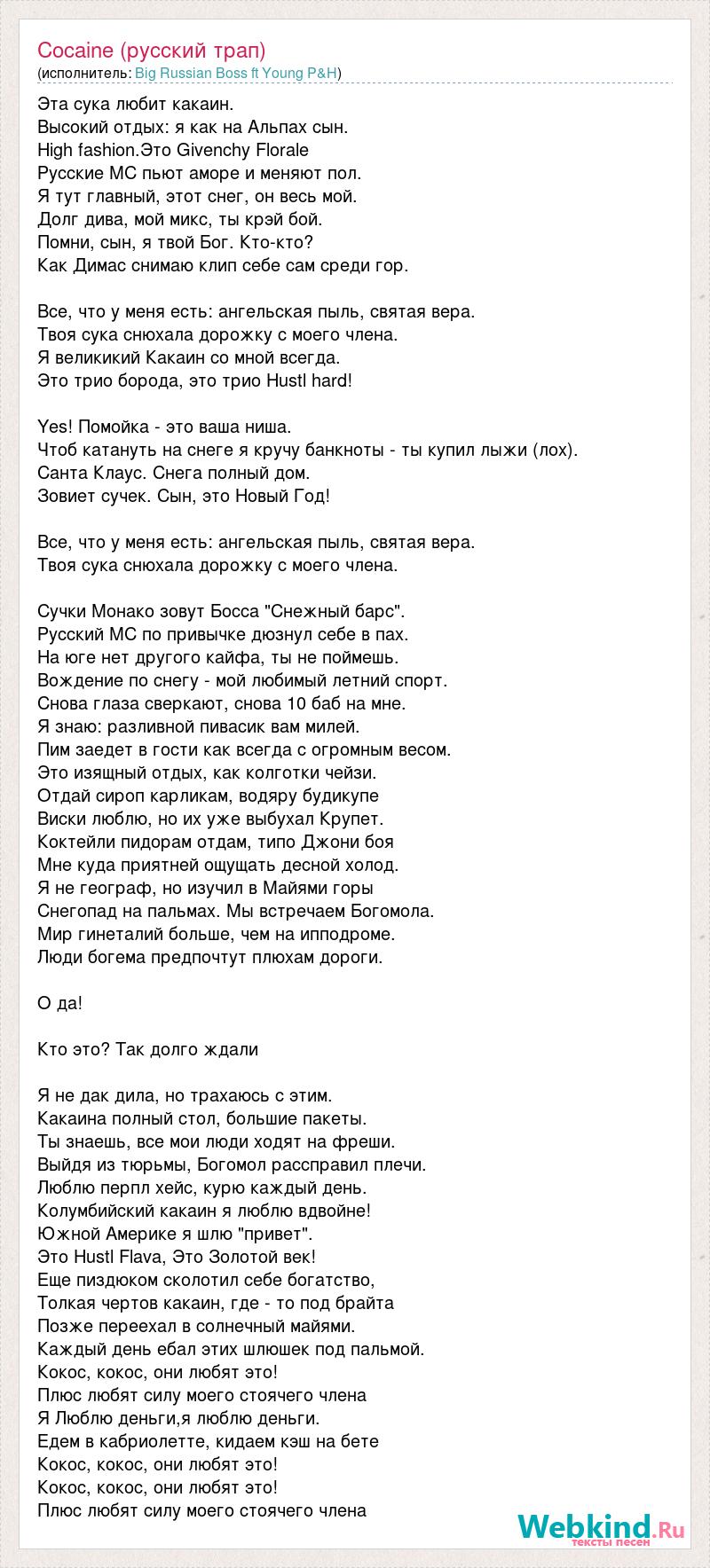 Эта сука любит какаин. Высокий отдых: я как на Альпах сын. High fashion.Это Givenchy Florale Русские МС пьют аморе и меняют пол. Я тут главный, этот снег, он весь мой. Долг дива, мой микс, ты крэй бой. Помни, сын, я твой Бог. Кто-кто? Как Димас снимаю клип себе сам среди гор. Все, что у меня есть: ангельская пыль, святая вера. Твоя сука снюхала дорожку с моего члена. Я великикий Какаин со мной всегда. Это трио борода, это трио Hustl hard! Yes! Помойка - это ваша ниша. Чтоб катануть на снеге я кручу банкноты - ты купил лыжи (лох). Санта Клаус. Снега полный дом. Зовиет сучек. Сын, это Новый Год! Все, что у меня есть: ангельская пыль, святая вера. Твоя сука снюхала дорожку с моего члена. Сучки Монако зовут Босса "Снежный барс". Русский МС по привычке дюзнул себе в пах. На юге нет другого кайфа, ты не поймешь. Вождение по снегу - мой любимый летний спорт. Снова глаза сверкают, снова 10 баб на мне. Я знаю: разливной пивасик вам милей. Пим заедет в гости как всегда с огромным весом. Это изящный отдых, как колготки чейзи. Отдай сироп карликам, водяру будикупе Виски люблю, но их уже выбухал Крупет. Коктейли пидорам отдам, типо Джони боя Мне куда приятней ощущать десной холод. Я не географ, но изучил в Майями горы Снегопад на пальмах. Мы встречаем Богомола. Мир гинеталий больше, чем на ипподроме. Люди богема предпочтут плюхам дороги. О да! Кто это? Так долго ждали Я не дак дила, но трахаюсь с этим. Какаина полный стол, большие пакеты. Ты знаешь, все мои люди ходят на фреши. Выйдя из тюрьмы, Богомол рассправил плечи. Люблю перпл хейс, курю каждый день. Колумбийский какаин я люблю вдвойне! Южной Америке я шлю "привет". Это Hustl Flava, Это Золотой век! Еще пиздюком сколотил себе богатство, Толкая чертов какаин, где - то под брайта Позже переехал в солнечный майями. Каждый день ебал этих шлюшек под пальмой. Кокос, кокос, они любят это! Плюс любят силу моего стоячего члена Я Люблю деньги,я люблю деньги. Едем в кабриолетте, кидаем кэш на бете Кокос, кокос, они любят это! Кокос, кокос, они любят это! Плюс любят силу моего стоячего члена